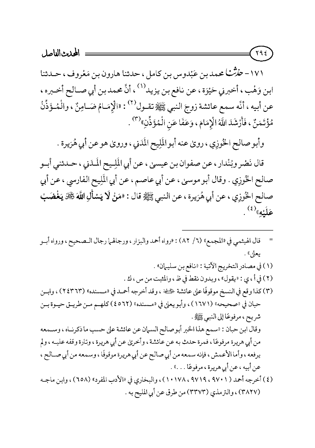١٧١ - حدثنا محمد بن عَبْدوس بن كامل، حدثنا هارون بن مَعْروف، حدثنا ابن وَهْب، أخبرني حَيْوَة، عن نافع بن يزيد (¬١)، أنَّ محمد بن أبي صالح أخبره، عن أبيه، أنَّه سمع عائشة زوجَ النبي - صلى الله عليه وسلم - تقول (¬٢): «الْإِمَامُ ضَامِنٌ، والْمُؤَذِّنُ مُؤْتَمَنٌ، فَأَرْشَدَ اللهُ الْإِمَامَ، وَعَفَا عَنِ الْمُؤَذِّنِ» (¬٣).