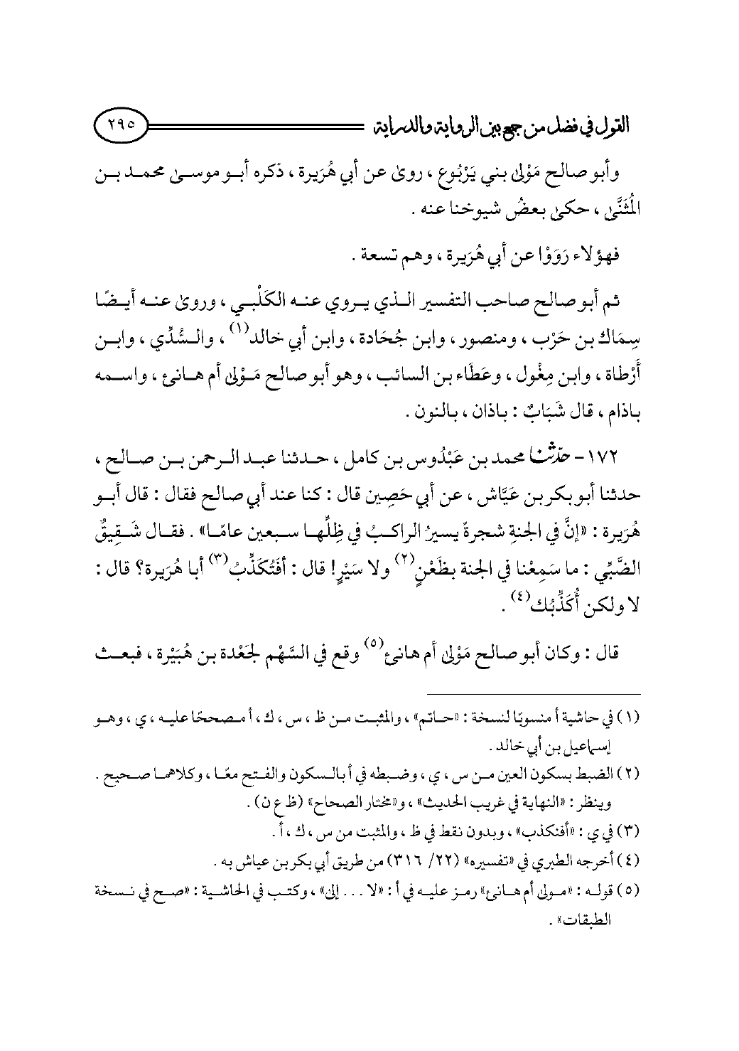 ١٧٢ - حدثنا محمد بن عَبْدُوس بن كامل، حدثنا عبد الرحمن بن صالح، حدثنا أبو بكر بن عَيَّاش، عن أبي حَصِين قال: كنا عند أبي صالح فقال: قال أبو هُرَيرة: «إنَّ في الجنةِ شجرةً يسيرُ الراكبُ في ظِلِّها سبعين عامًا». فقال شَقِيقٌ الضَّبِّي: ما سَمِعْنا في الجنة بظَعْنٍ (¬٢) ولا سَيْرٍ! قال: أفَتُكَذِّبُ (¬٣) أبا هُرَيرة؟ قال: لا ولكن أُكَذِّبُك (¬٤).
