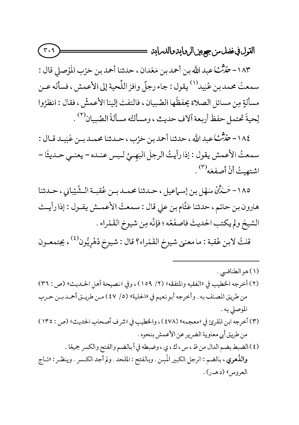 ١٨٥ - حدثني سَهْل بن إسماعيل، حدثنا محمد بن عُقبة الشَّيْباني، حدثنا هارون بن حاتم، حدثنا عَثَّام بن علي قال: سمعتُ الأعمش يقول: إذا رأيتَ الشيخَ ولم يكتب الحديثَ فاصفَعْه؛ فإنَّه مِن شيوخ القَمْراء.