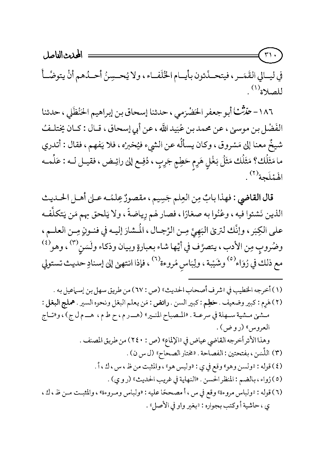 قال القاضي: فهذا بابٌ مِن العِلم جَسِيم، مقصورٌ عِلمُه على أهل الحديث الذين نَشئوا فيه، وعُنُوا به صغارًا، فصار لهم رِياضةً، ولا يَلحق بهم مَن يَتكلَّفه على الكِبَر، وإنَّك لترى البَهِيَّ مِن الرِّجال، المُشارَ إليه في فنونٍ مِن العلم، وضُروبٍ مِن الأدب، يتصرَّف في أيِّها شاء بعبارةٍ وبيان وذكاء ولَسَنٍ (¬٣)، وهو (¬٤) مع ذلك في رُوَاء (¬٥) وشَيْبة، ولِبَاسِ مُروءة (¬٦)، فإذا انتهى إلى إسنادِ حديث تستولي