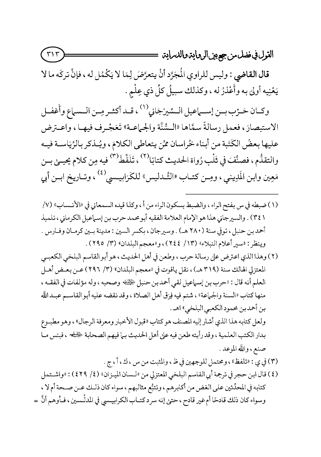 وكان حَرْب بن إسماعيل السِّيرْجَاني (¬١)، قد أكثر مِن السماع وأَغفل الاستبصارَ، فعمل رسالةً سمَّاها «السُّنَّة والجماعة» تَعَجْرف فيها، واعترض عليها بعضُ الكَتَبة من أبناء خُراسان ممَّن يتعاطى الكلامَ، ويُذكر بالرِّيَاسة فيه والتقدُّم، فصنَّفَ في ثَلْب رُواة الحديث كتابًا (¬٢)،