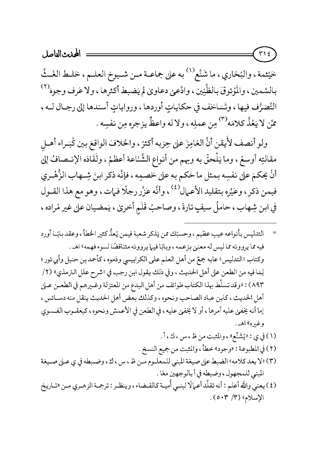 خَيْثمة، والبُخاري، ما شَنَّع (¬١) به على جماعة من شيوخ العلم، خَلط الغَثَّ بالسَّمين، والمَوْثوقَ بالظَّنِين، وادَّعى دعاوى لم يَضبط أكثرها، ولا عَرف وجوهَ (¬٢) التَّصَرُّف فيها، وتَسَاخَف في حكاياتٍ أوردها، ورواياتٍ أسندها إلى رجال له، ممَّن لا يَعُدُّ كلامَه (¬٣) مِن عملِه، ولا له واعظٌ يزجره مِن نفسِه.