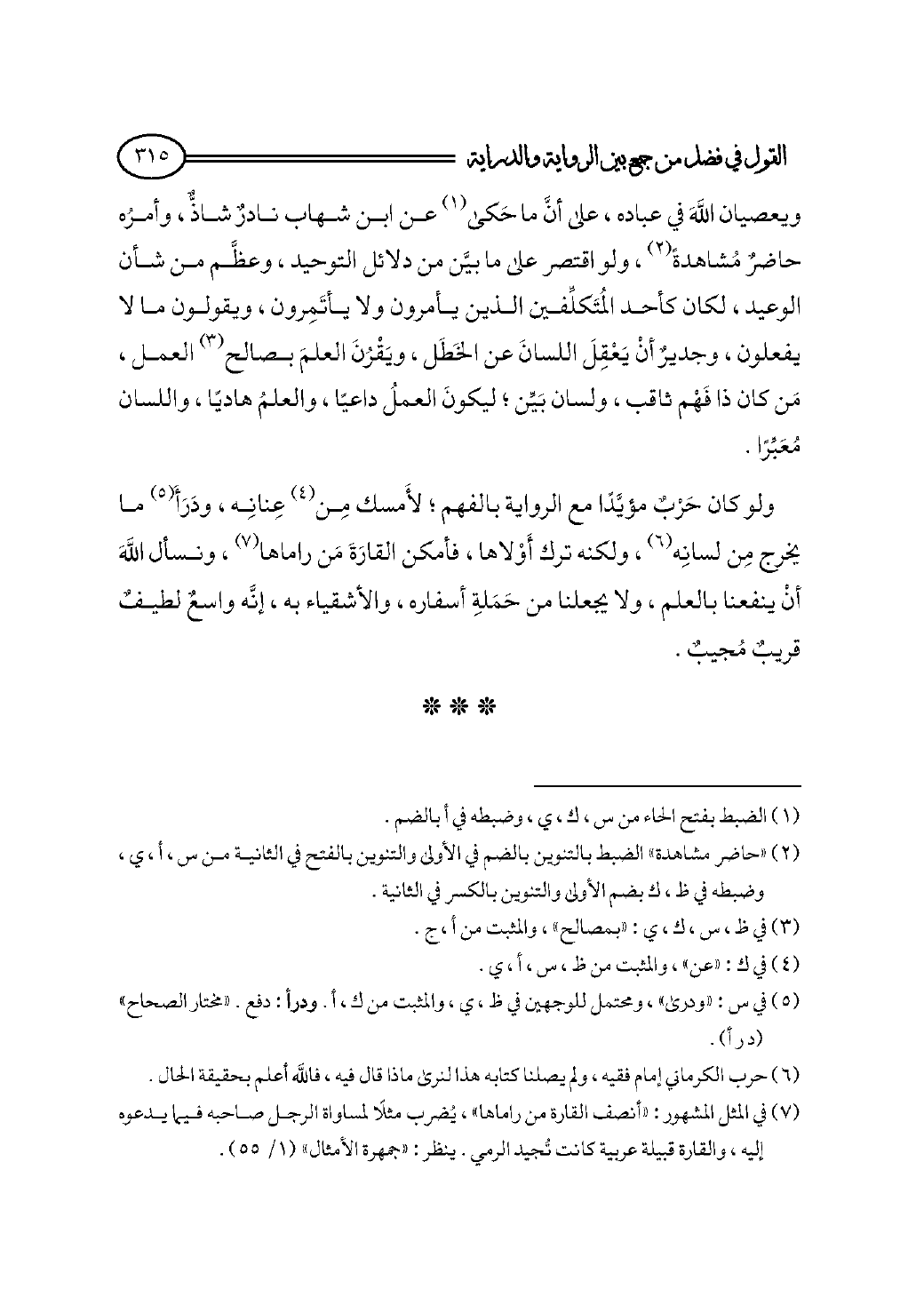 ولو كان حَرْبٌ مؤيَّدًا مع الرواية بالفهم؛ لأَمسك مِن (¬٤) عِنانِه، ودَرَأَ (¬٥) ما يخرج مِن لسانِه (¬٦)، ولكنه ترك أَوْلاها، فأمكن القارَةَ مَن راماها (¬٧)، ونسأل اللهَ أنْ ينفعنا بالعلم، ولا يجعلنا من حَمَلةِ أسفاره، والأشقياء به، إنَّه واسعٌ لطيفٌ قريبٌ مُجيبٌ.