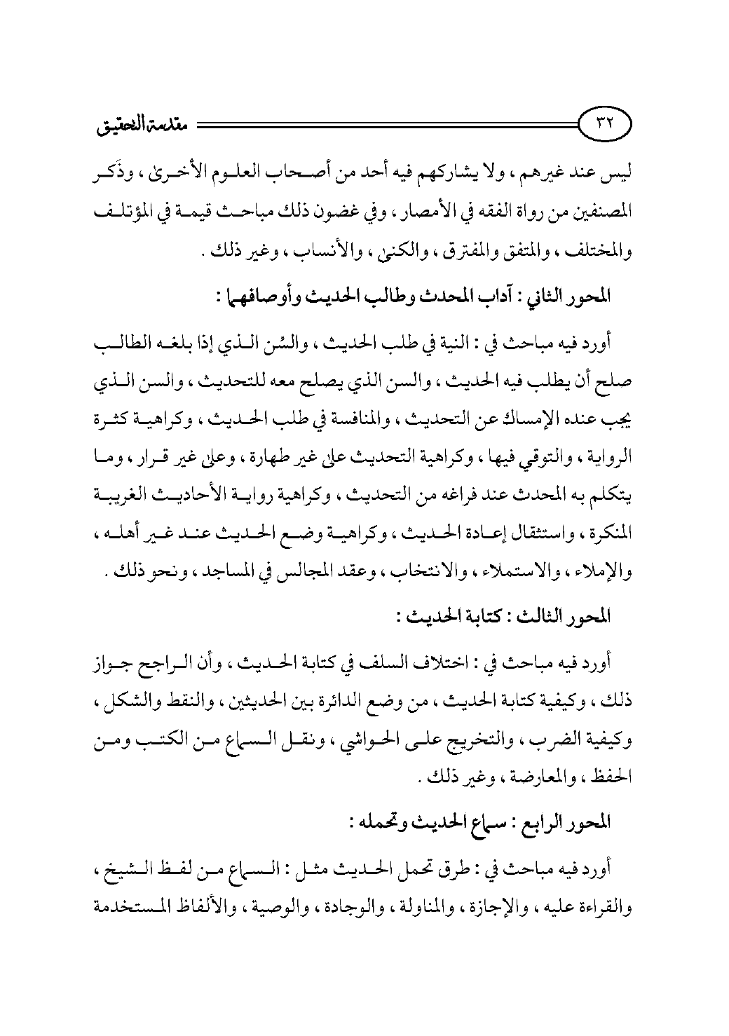 أورد فيه مباحث في: طرق تحمل الحديث مثل: السماع من لفظ الشيخ، والقراءة عليه، والإجازة، والمناولة، والوجادة، والوصية، والألفاظ المستخدمة