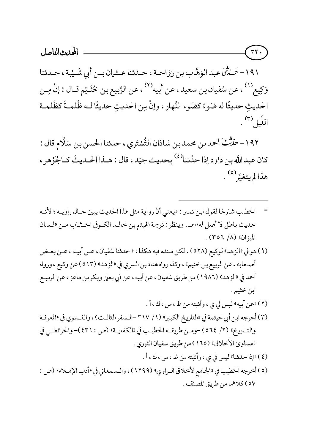 ١٩١ - حدثني عبد الوَهَّاب بن رَوَاحة، حدثنا عثمان بن أبي شَيْبة، حدثنا وَكِيع (¬١)، عن سُفيان بن سعيد، عن أبيه (¬٢)، عن الرَّبيع بن خُثَيْم قال: إنَّ مِن الحديثِ حديثًا له ضَوءٌ كضَوء النَّهار، وإنَّ مِن الحديثِ حديثًا له ظُلمةٌ كظُلمة اللَّيل (¬٣).