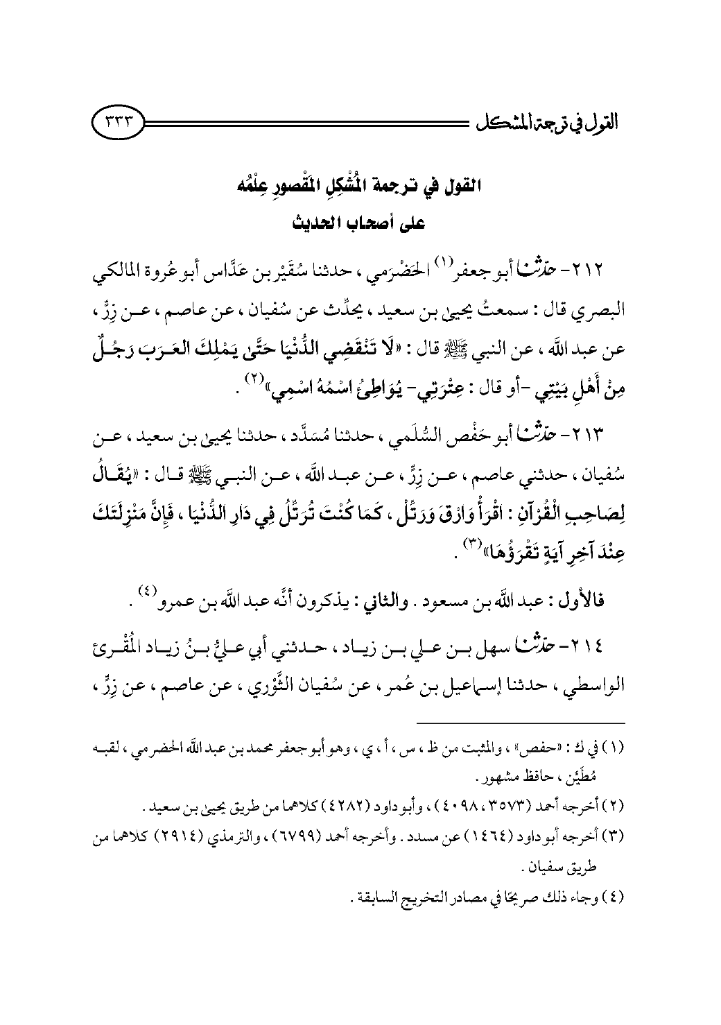 ٢١٣ - حدثنا أبو حَفْص السُّلَمي، حدثنا مُسَدَّد، حدثنا يحيى بن سعيد، عن سُفيان، حدثني عاصم، عن زِرٍّ، عن عبد الله، عن النبي - صلى الله عليه وسلم - قال: «يُقَالُ لِصَاحِبِ الْقُرْآنِ: اقْرَأْ وَارْقَ وَرَتِّلْ، كَمَا كُنْتَ تُرَتِّلُ فِي دَارِ الدُّنْيَا، فَإِنَّ مَنْزِلَتَكَ عِنْدَ آخِرِ آيَةٍ تَقْرَؤُهَا» (¬٣).