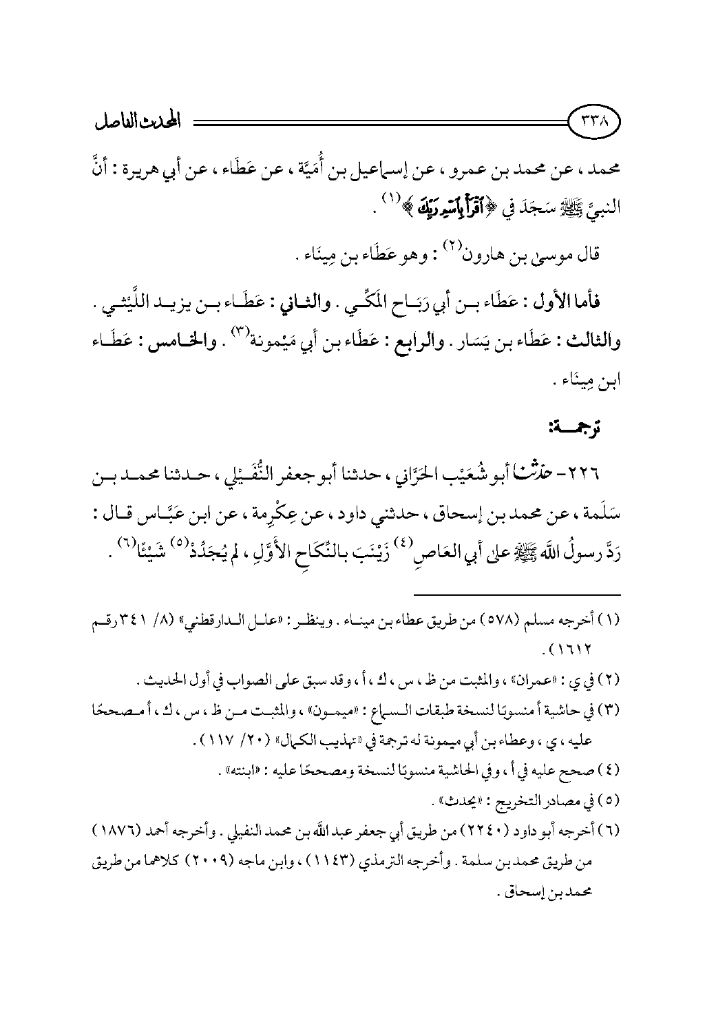 ٢٢٦ - حدثنا أبو شُعَيْب الحَرَّاني، حدثنا أبو جعفر النُّفَيْلي، حدثنا محمد بن سَلَمة، عن محمد بن إسحاق، حدثني داود، عن عِكْرِمة، عن ابن عَبَّاس قال: رَدَّ رسولُ الله - صلى الله عليه وسلم - على أبي العَاصِ (¬٤) زَيْنَبَ بالنِّكَاحِ الأَوَّلِ، لم يُجَدِّدْ (¬٥) شَيْئًا (¬٦).