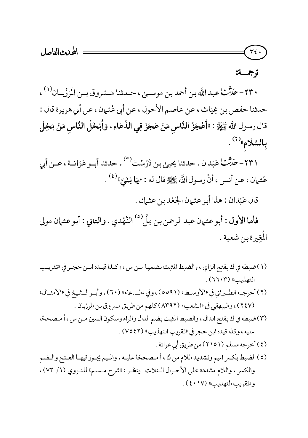 ٢٣٠ - حدثنا عبد الله بن أحمد بن موسى، حدثنا مَسْروق بن المَرْزُبان (¬١)، حدثنا حفص بن غِيَاث، عن عاصم الأحول، عن أبي عُثمان، عن أبي هريرة قال: قال رسول الله - صلى الله عليه وسلم - : «أَعْجَزُ النَّاسِ مَنْ عَجَزَ فِي الدُّعَاءِ، وَأَبْخَلُ النَّاسِ مَنْ بَخِلَ بِالسَّلَامِ» (¬٢).