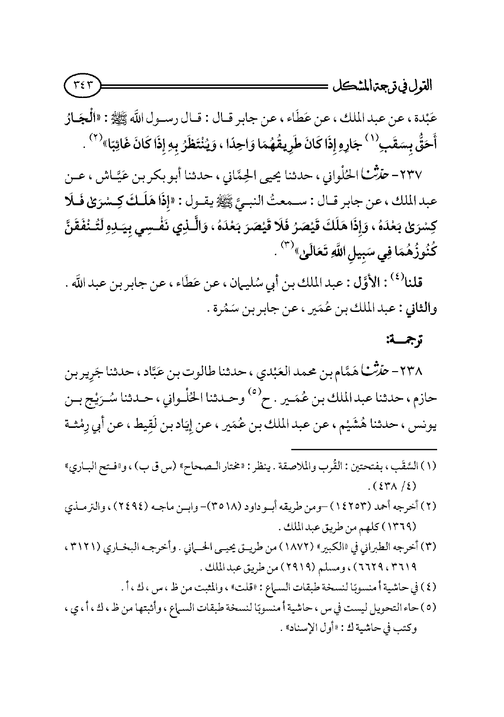 ٢٣٨ - حدثنا هَمَّام بن محمد العَبْدي، حدثنا طالوت بن عَبَّاد، حدثنا جَرِير بن حازم، حدثنا عبد الملك بن عُمَير. ح (¬٥) وحدثنا الحُلْواني، حدثنا سُرَيْج بن يونس، حدثنا هُشَيْم، عن عبد الملك بن عُمَير، عن إِيَاد بن لَقِيط، عن أبي رِمْثة