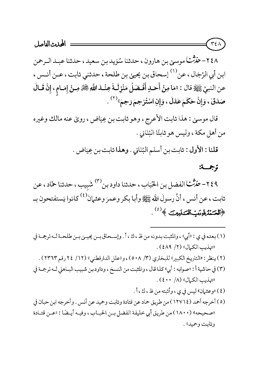 ٢٤٩ - حدثنا الفضل بن الحُبَاب، حدثنا داود بن (¬٣) شَبِيب، حدثنا حمَّاد، عن ثابت، عن أنس، أنَّ رسولَ الله - صلى الله عليه وسلم - وأبا بكر وعمرَ وعثمانَ (¬٤) كانوا يَستفتحون بـ {الْحَمْدُ لِلَّهِ رَبِّ الْعَالَمِينَ} (¬٥).