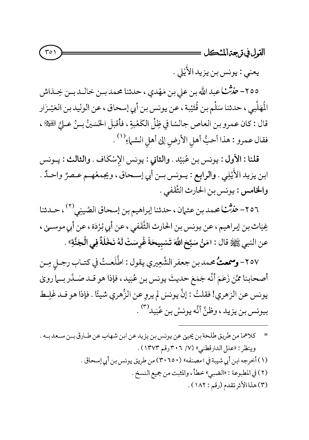 قلنا: الأول: يونس بن عُبَيْد. والثاني: يونس الإِسْكَاف. والثالث: يونس ابن يزيد الأَيْلِي. والرابع: يونس بن أبي إسحاق، ويجمعُهم عصرٌ واحدٌ. والخامس: يونس بن الحارث الثَّقَفي.