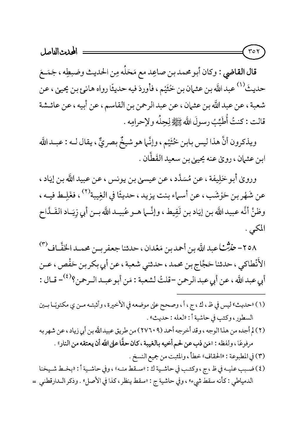 قال القاضي: وكان أبو محمد بن صاعِد مع مَحَلِّه مِن الحديث وضبطِه، جَمَعَ حديثَ (¬١) عبد الله بن عثمان بن خُثَيْم، فأوردَ فيه حديثًا رواه هانئ بن يحيى، عن شعبة، عن عبد الله بن عثمان، عن عبد الرحمن بن القاسم، عن أبيه، عن عائشة قالت: كنتُ أُطَيِّبُ رسولَ الله - صلى الله عليه وسلم - لِحِلِّه ولإحرامِه.