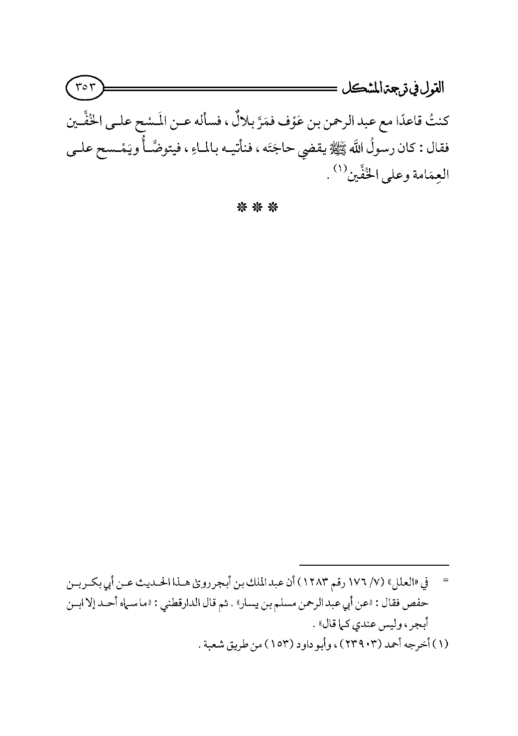 كنتُ قاعدًا مع عبد الرحمن بن عَوْف فمَرَّ بلالٌ، فسأله عن المَسْح على الخُفَّين فقال: كان رسولُ الله - صلى الله عليه وسلم - يقضي حاجَتَه، فنأتيه بالماءِ، فيتوضَّأُ ويَمْسح على العِمَامة وعلى الخُفَّين (¬١).