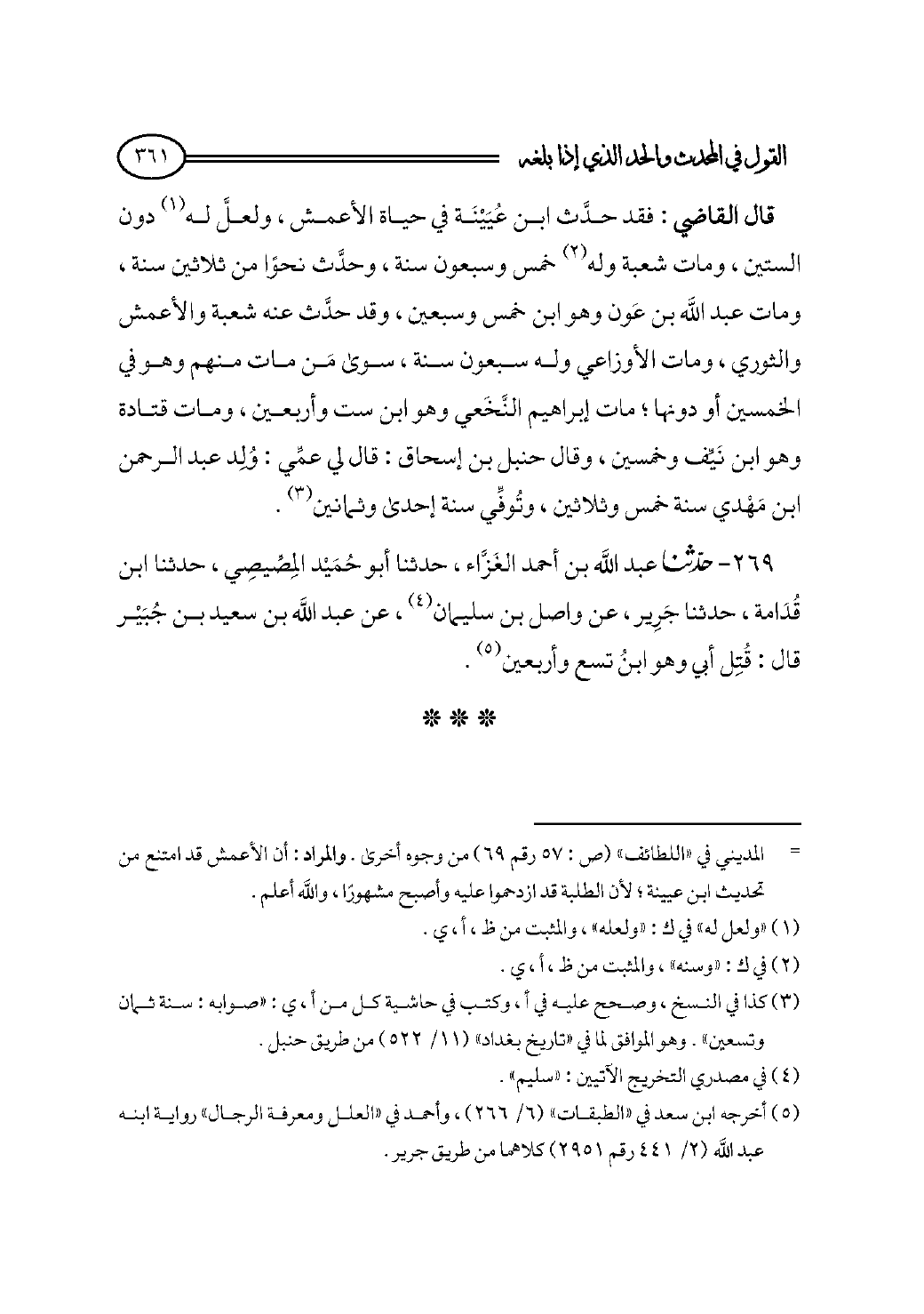 قال القاضي: فقد حدَّث ابن عُيَيْنَة في حياة الأعمش، ولعلَّ له (¬١) دون الستين، ومات شعبة وله (¬٢) خمس وسبعون سنة، وحدَّث نحوًا من ثلاثين سنة، ومات عبد الله بن عَون وهو ابن خمس وسبعين، وقد حدَّث عنه شعبة والأعمش والثوري، ومات الأوزاعي وله سبعون سنة، سوى مَن مات منهم وهو في الخمسين أو دونها؛ مات إبراهيم النَّخَعي وهو ابن ست وأربعين، ومات قتادة وهو ابن نَيِّف وخمسين، وقال حنبل بن إسحاق: قال لي عمِّي: وُلِد عبد الرحمن ابن مَهْدي سنة خمس وثلاثين، وتُوفِّي سنة إحدى وثمانين (¬٣).