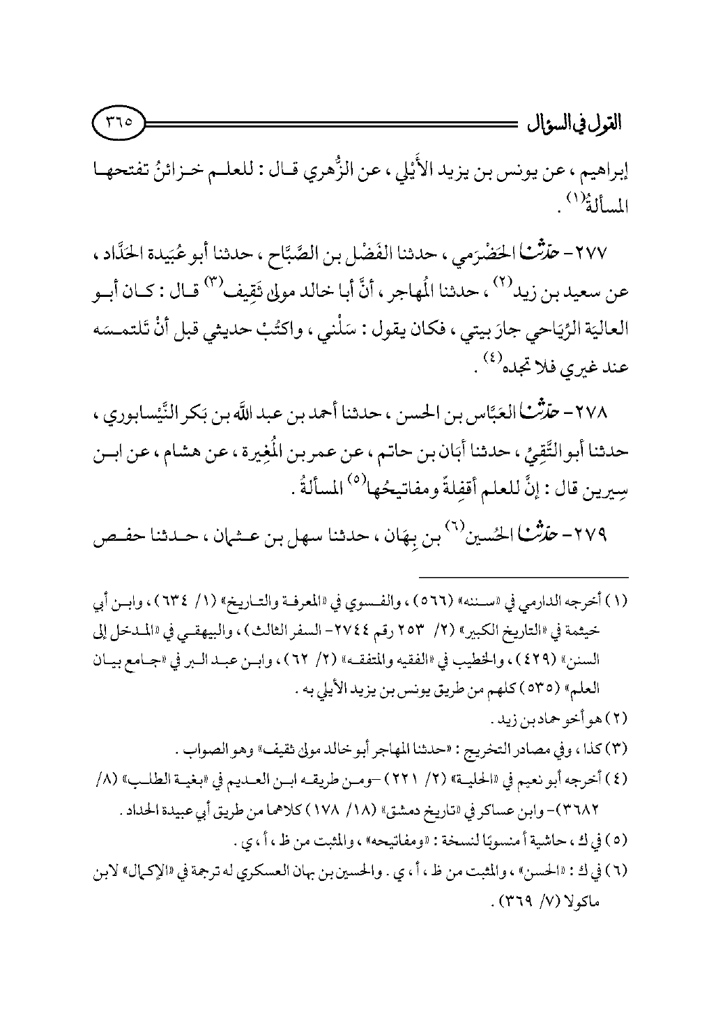 ٢٧٨ - حدثنا العَبَّاس بن الحسن، حدثنا أحمد بن عبد الله بن بَكر النَّيْسابوري، حدثنا أبو التَّقِيِّ، حدثنا أبَان بن حاتم، عن عمر بن المُغِيرة، عن هشام، عن ابن سِيرين قال: إنَّ للعلم أقفِلةً ومفاتيحُها (¬٥) المسألةُ.