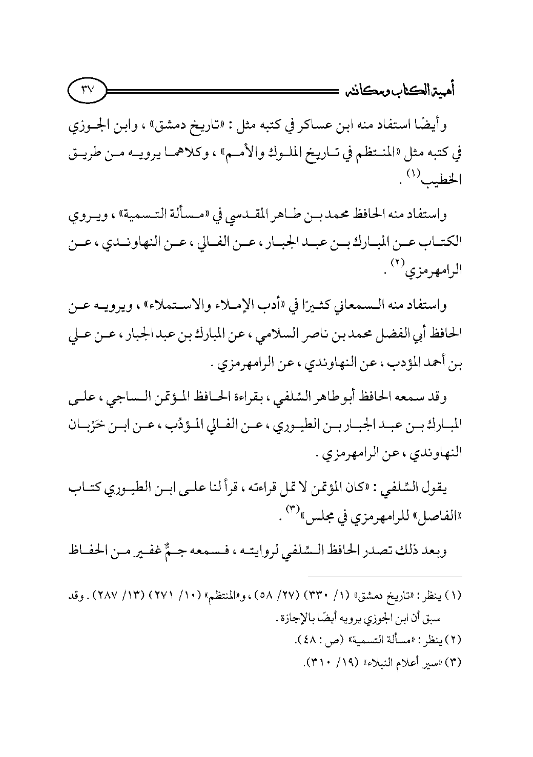 واستفاد منه الحافظ محمد بن طاهر المقدسي في «مسألة التسمية»، ويروي الكتاب عن المبارك بن عبد الجبار، عن الفالي، عن النهاوندي، عن الرامهرمزي (¬٢).