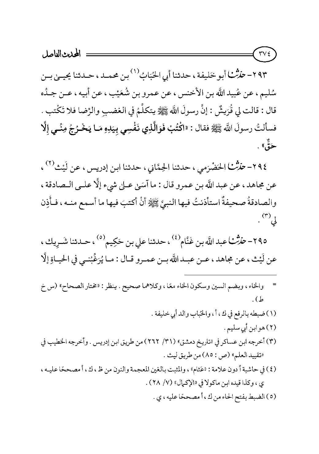 ٢٩٤ - حدثنا الحَضْرَمي، حدثنا الحِمَّاني، حدثنا ابن إدريس، عن لَيْث (¬٢)، عن مجاهد، عن عبد الله بن عمرو قال: ما آسَى على شيء إلَّا على الصادقة، والصادقةُ صحيفةٌ استأذنتُ فيها النبيَّ - صلى الله عليه وسلم - أنْ أكتبَ فيها ما أسمع منه، فأَذِن لي (¬٣).