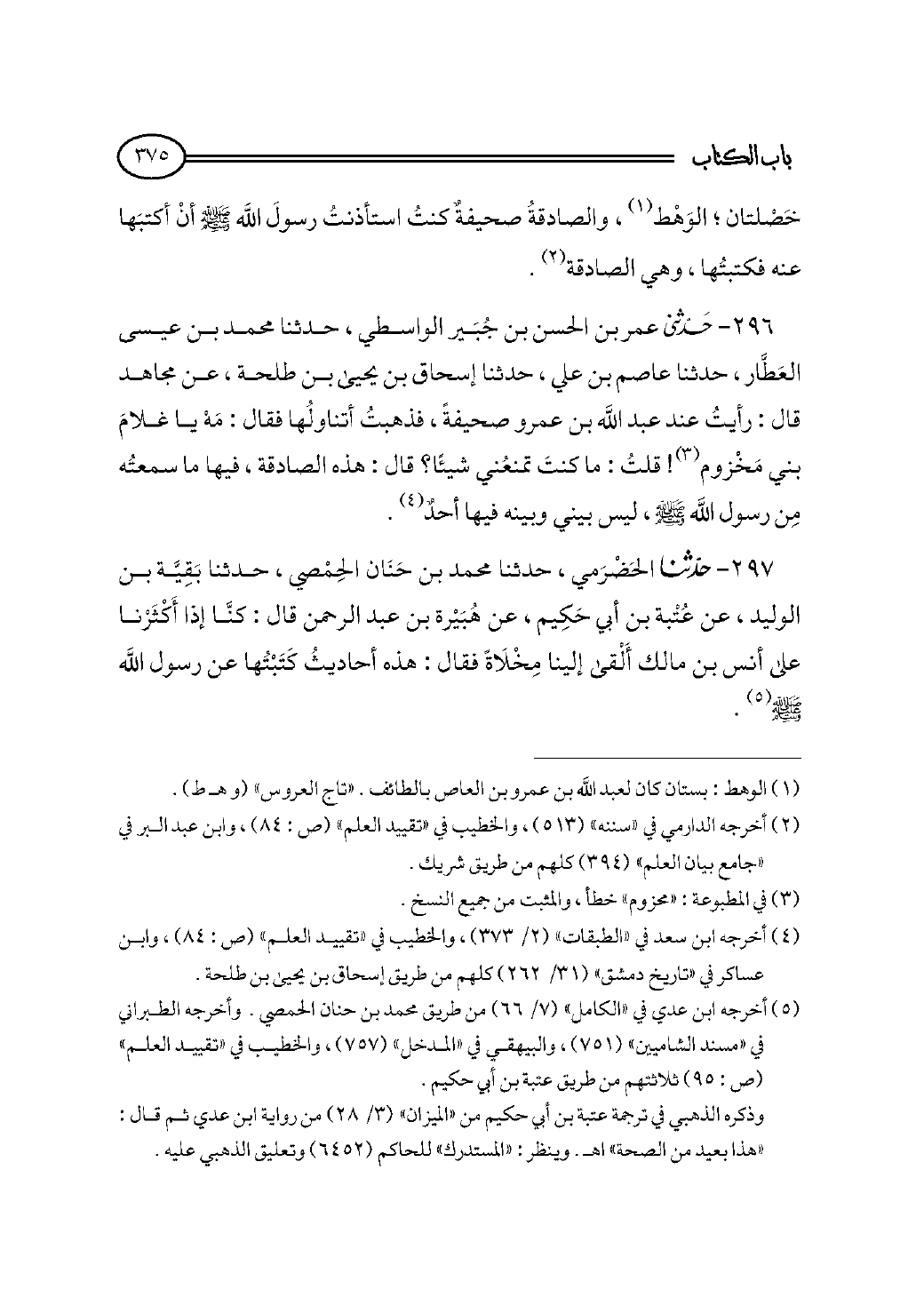 ٢٩٦ - حدثني عمر بن الحسن بن جُبَير الواسطي، حدثنا محمد بن عيسى العَطَّار، حدثنا عاصم بن علي، حدثنا إسحاق بن يحيى بن طلحة، عن مجاهد قال: رأيتُ عند عبد الله بن عمرو صحيفةً، فذهبتُ أتناولُها فقال: مَهْ يا غلامَ بني مَخْزوم (¬٣)! قلتُ: ما كنتَ تمنعُني شيئًا؟ قال: هذه الصادقة، فيها ما سمعتُه مِن رسول الله - صلى الله عليه وسلم - ، ليس بيني وبينه فيها أحدٌ (¬٤).
