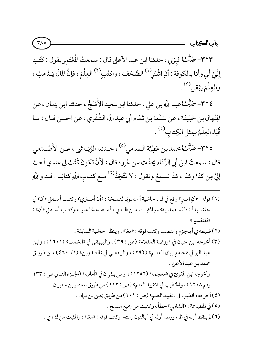 ٣٢٥ - حدثنا محمد بن عَطِيَّة السامي (¬٥)، حدثنا الرِّيَاشي، عن الأَصْمَعي قال: سمعتُ ابنَ أبي الزِّنَاد يحدِّث عن عُرْوة قال: لَأَنْ تكونَ كُتُبٌ لي عندي أحبَّ إليَّ مِن كذا وكذا، كنَّا نسمعُ ونقول: لا نَتَّخِذُ (¬٦) مع كتابِ اللهِ كتابًا. قد واللهِ