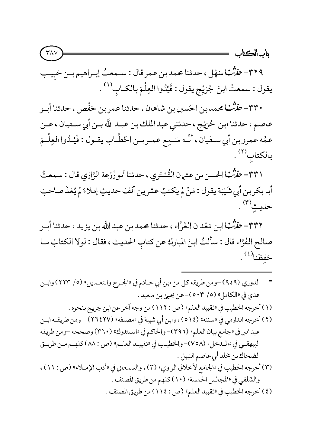 ٣٢٩ - حدثنا سَهْل، حدثنا محمد بن عمر قال: سمعتُ إبراهيم بن حَبِيب يقول: سمعتُ ابنَ جُرَيْج يقول: قَيِّدُوا العِلْمَ بالكتابِ (¬١).