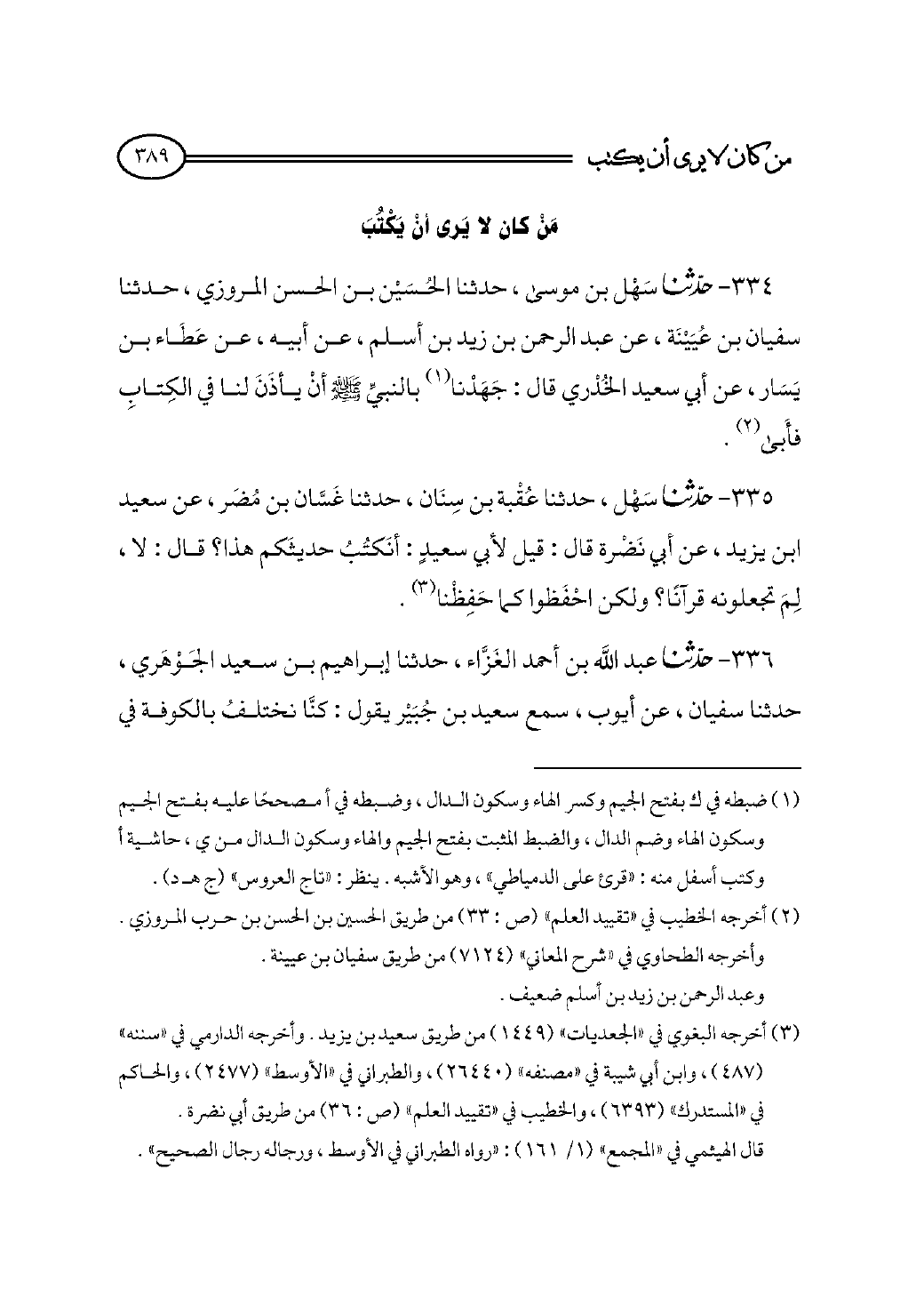 ٣٣٤ - حدثنا سَهْل بن موسى، حدثنا الحُسَيْن بن الحسن المروزي، حدثنا سفيان بن عُيَيْنَة، عن عبد الرحمن بن زيد بن أسلم، عن أبيه، عن عَطَاء بن يَسَار، عن أبي سعيد الخُدْري قال: جَهَدْنا (¬١) بالنبيِّ - صلى الله عليه وسلم - أنْ يأذَنَ لنا في الكِتابِ فأَبى (¬٢).