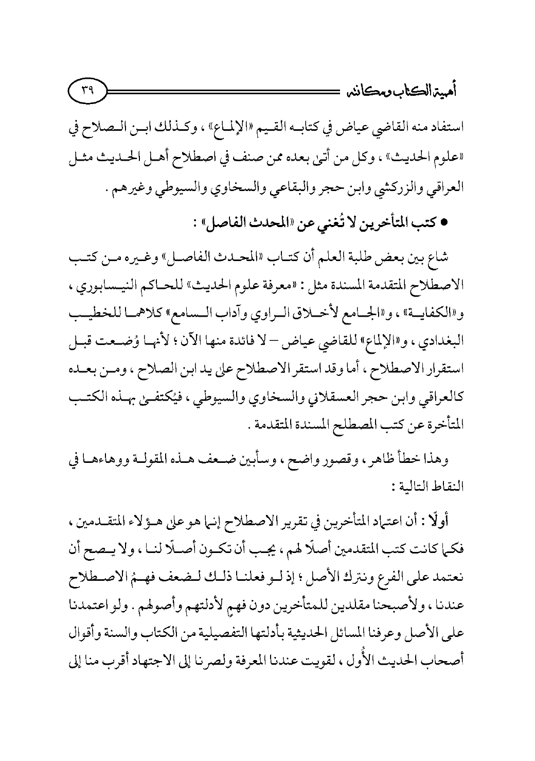 • كتب المتأخرين لا تُغني عن «المحدث الفاصل»: