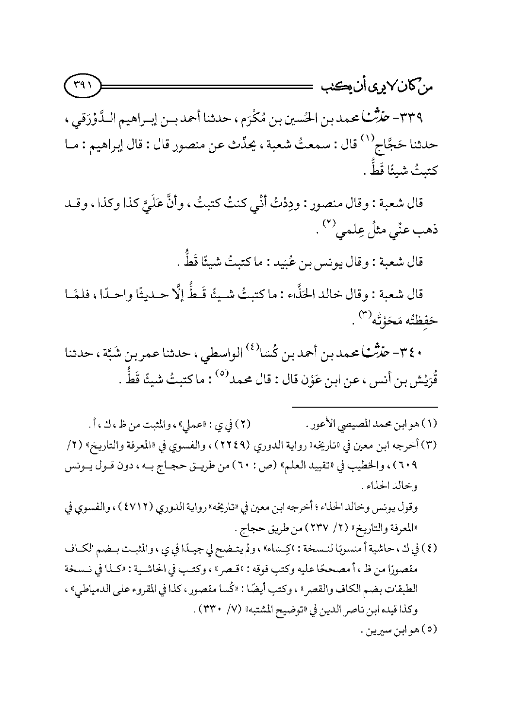 ٣٤٠ - حدثنا محمد بن أحمد بن كُسَا (¬٤) الواسطي، حدثنا عمر بن شَبَّة، حدثنا قُرَيْش بن أنس، عن ابن عَوْن قال: قال محمد (¬٥): ما كتبتُ شيئًا قَطُّ.