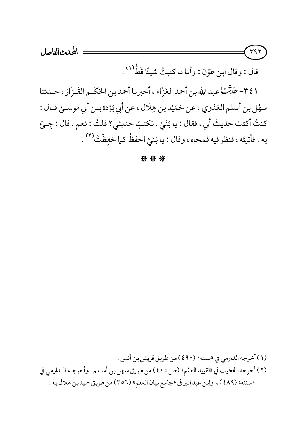 ٣٤١ - حدثنا عبد الله بن أحمد الغَزَّاء، أخبرنا أحمد بن الحَكَم القَزَّاز، حدثنا سَهْل بن أسلم العَدَوي، عن حُمَيْد بن هِلَال، عن أبي بُرْدة بن أبي موسى قال: كنتُ أكتبُ حديثَ أبي، فقال: يا بُنَيَّ، تكتبُ حديثي؟ قلتُ: نعم. قال: جِئْ به. فأتيتُه، فنظر فيه فمحاه، وقال: يا بُنَيَّ احفظْ كما حَفِظْتُ (¬٢).