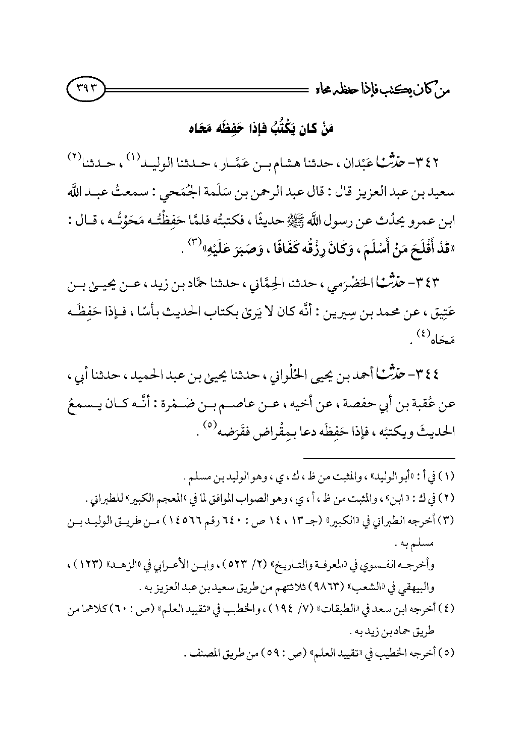 ٣٤٣ - حدثنا الحَضْرَمي، حدثنا الحِمَّاني، حدثنا حمَّاد بن زيد، عن يحيى بن عَتِيق، عن محمد بن سِيرين: أنَّه كان لا يَرى بكتاب الحديث بأسًا، فإذا حَفِظَه مَحَاه (¬٤).