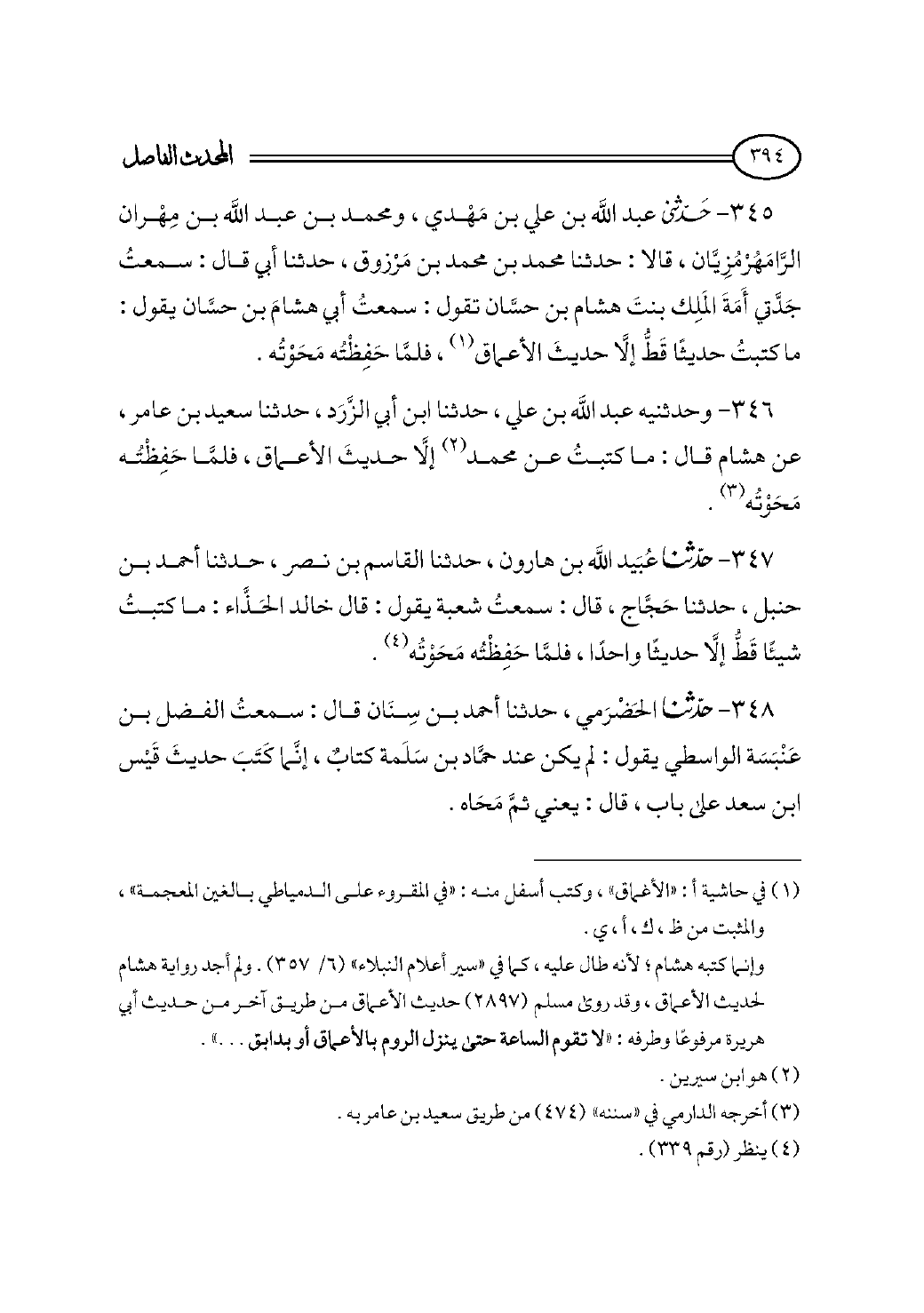٣٤٦ - وحدثنيه عبد الله بن علي، حدثنا ابن أبي الزَّرَد، حدثنا سعيد بن عامر، عن هشام قال: ما كتبتُ عن محمد (¬٢) إلَّا حديثَ الأعماق، فلمَّا حَفِظْتُه مَحَوْتُه (¬٣).