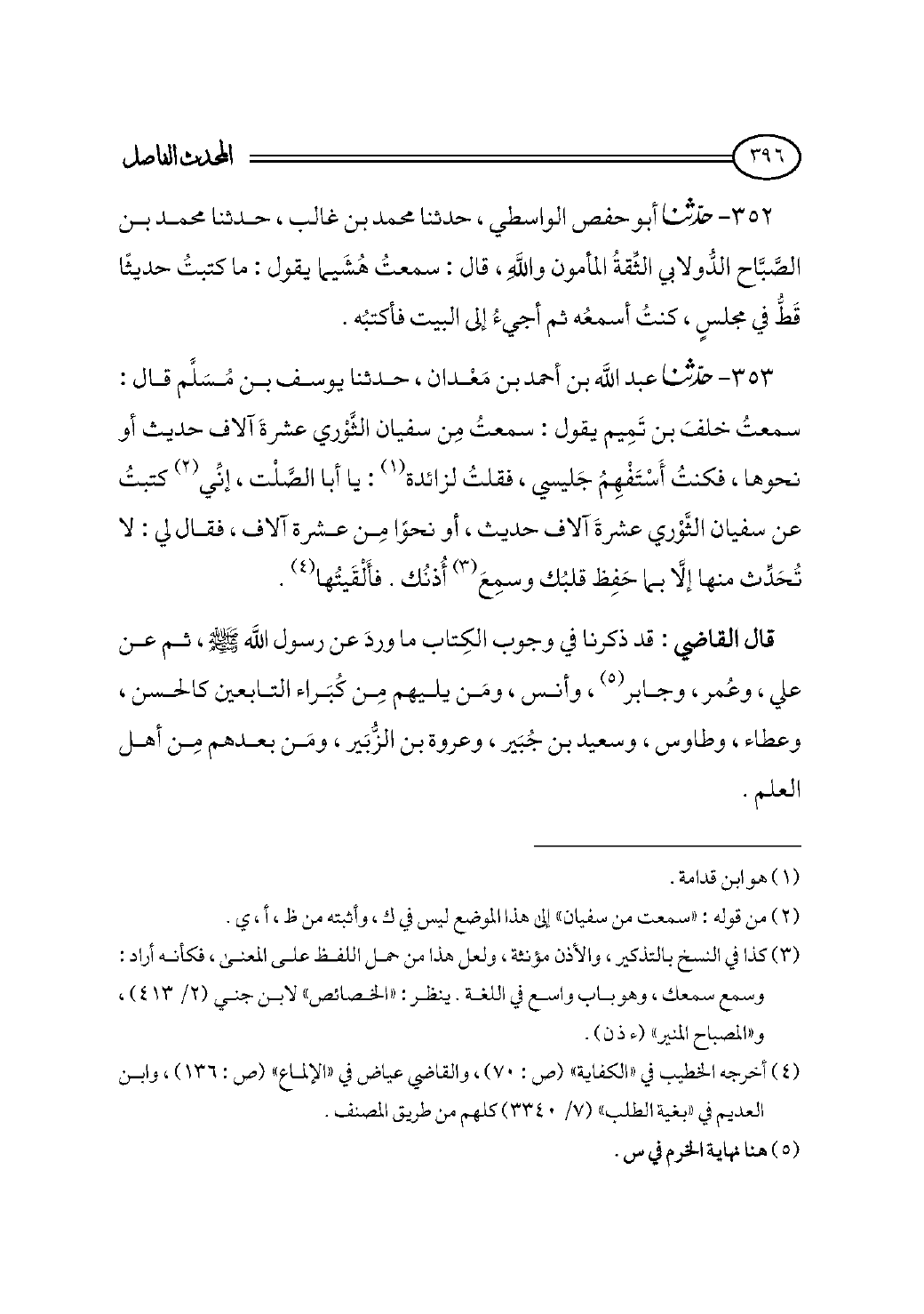 ٣٥٣ - حدثنا عبد الله بن أحمد بن مَعْدان، حدثنا يوسف بن مُسَلَّم قال: سمعتُ خلفَ بن تَمِيم يقول: سمعتُ مِن سفيان الثَّوْري عشرةَ آلاف حديث أو نحوها، فكنتُ أَسْتَفْهِمُ جَليسي، فقلتُ لزائدة (¬١): يا أبا الصَّلْت، إنِّي (¬٢) كتبتُ عن سفيان الثَّوْري عشرةَ آلاف حديث، أو نحوًا مِن عشرة آلاف، فقال لي: لا تُحَدِّث منها إلَّا بما حَفِظ قلبُك وسمِعَ (¬٣) أُذنُك. فأَلْقَيتُها (¬٤).