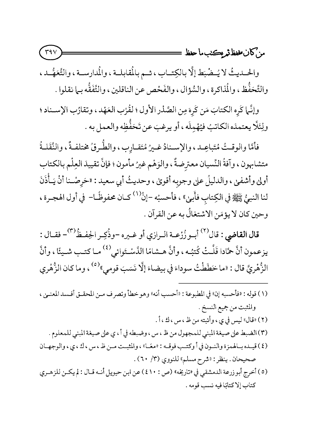 فأمَّا والوقتُ مُتَباعِد، والإسنادُ غيرُ مُتَقارِب، والطُّرقُ مختلفةٌ، والنَّقَلةُ متشابهون، وآفةُ النِّسيان معترِضةٌ، والوَهْم غيرُ مأمون؛ فإنَّ تقييدَ العِلْم بالكتاب أولى وأشفى، والدليلُ على وجوبِه أقوى، وحديثُ أبي سعيد: «حَرِصْنا أنْ يَأْذَنَ لنا النبيُّ - صلى الله عليه وسلم - في الكِتابِ فأَبى»، فأحسبُه -إنْ (¬١) كان محفوظًا- في أول الهجرة، وحين كان لا يؤمَن الاشتغالُ به عن القرآن.