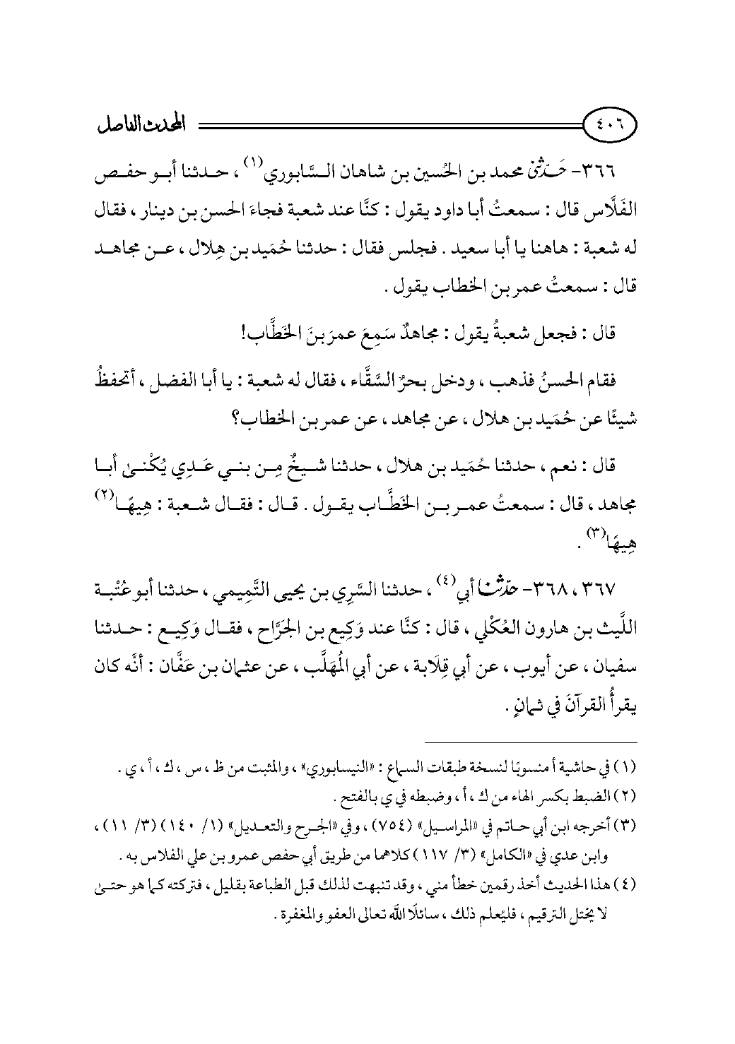 ٣٦٦ - حدثني محمد بن الحُسين بن شاهان السَّابوري (¬١)، حدثنا أبو حفص الفَلَّاس قال: سمعتُ أبا داود يقول: كنَّا عند شعبة فجاءَ الحسن بن دينار، فقال له شعبة: هاهنا يا أبا سعيد. فجلس فقال: حدثنا حُمَيد بن هِلال، عن مجاهد قال: سمعتُ عمر بن الخطاب يقول.