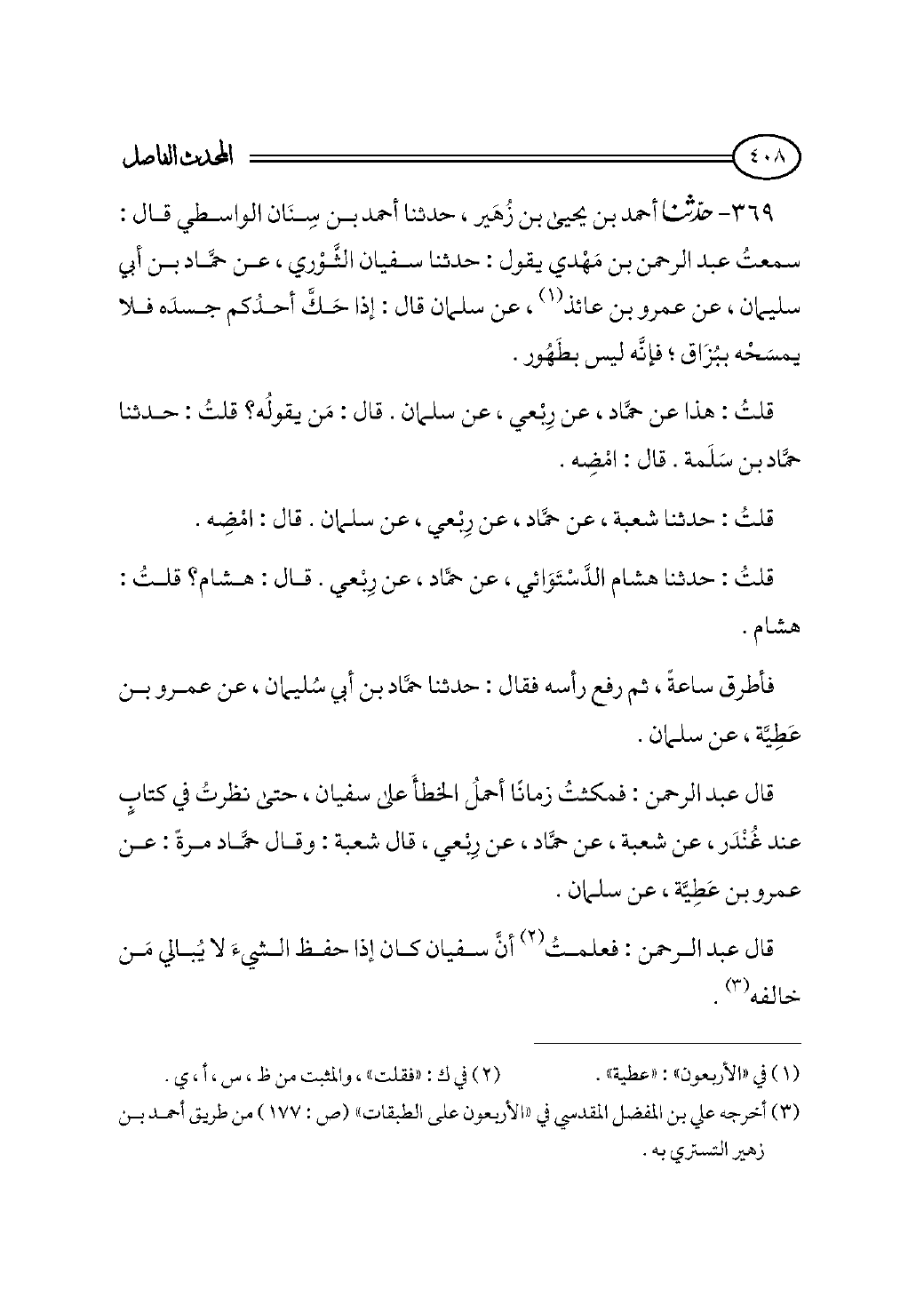 قال عبد الرحمن: فمكثتُ زمانًا أحملُ الخطأَ على سفيان، حتى نظرتُ في كتابٍ عند غُنْدَر، عن شعبة، عن حمَّاد، عن رِبْعي، قال شعبة: وقال حمَّاد مرةً: عن عمرو بن عَطِيَّة، عن سلمان.