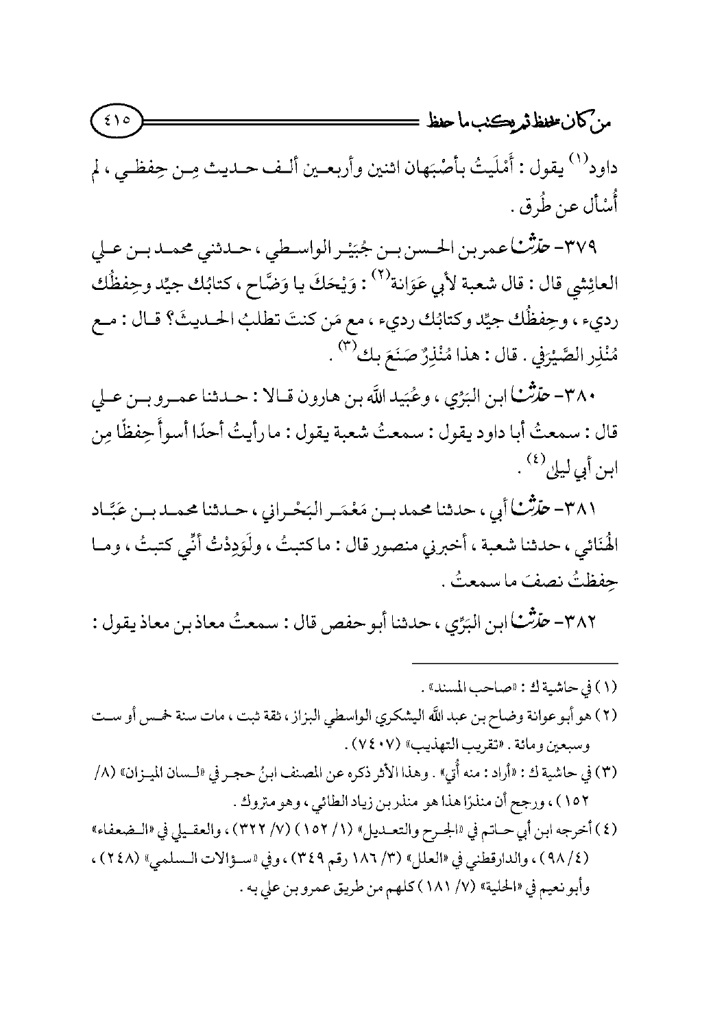 ٣٧٩ - حدثنا عمر بن الحسن بن جُبَيْر الواسطي، حدثني محمد بن علي العائِشي قال: قال شعبة لأبي عَوَانة (¬٢): وَيْحَكَ يا وَضَّاح، كتابُك جيِّد وحِفظُك رديء، وحِفظُك جيِّد وكتابُك رديء، مع مَن كنتَ تطلبُ الحديثَ؟ قال: مع مُنْذِر الصَّيْرَفي. قال: هذا مُنْذِرٌ صَنَعَ بك (¬٣).