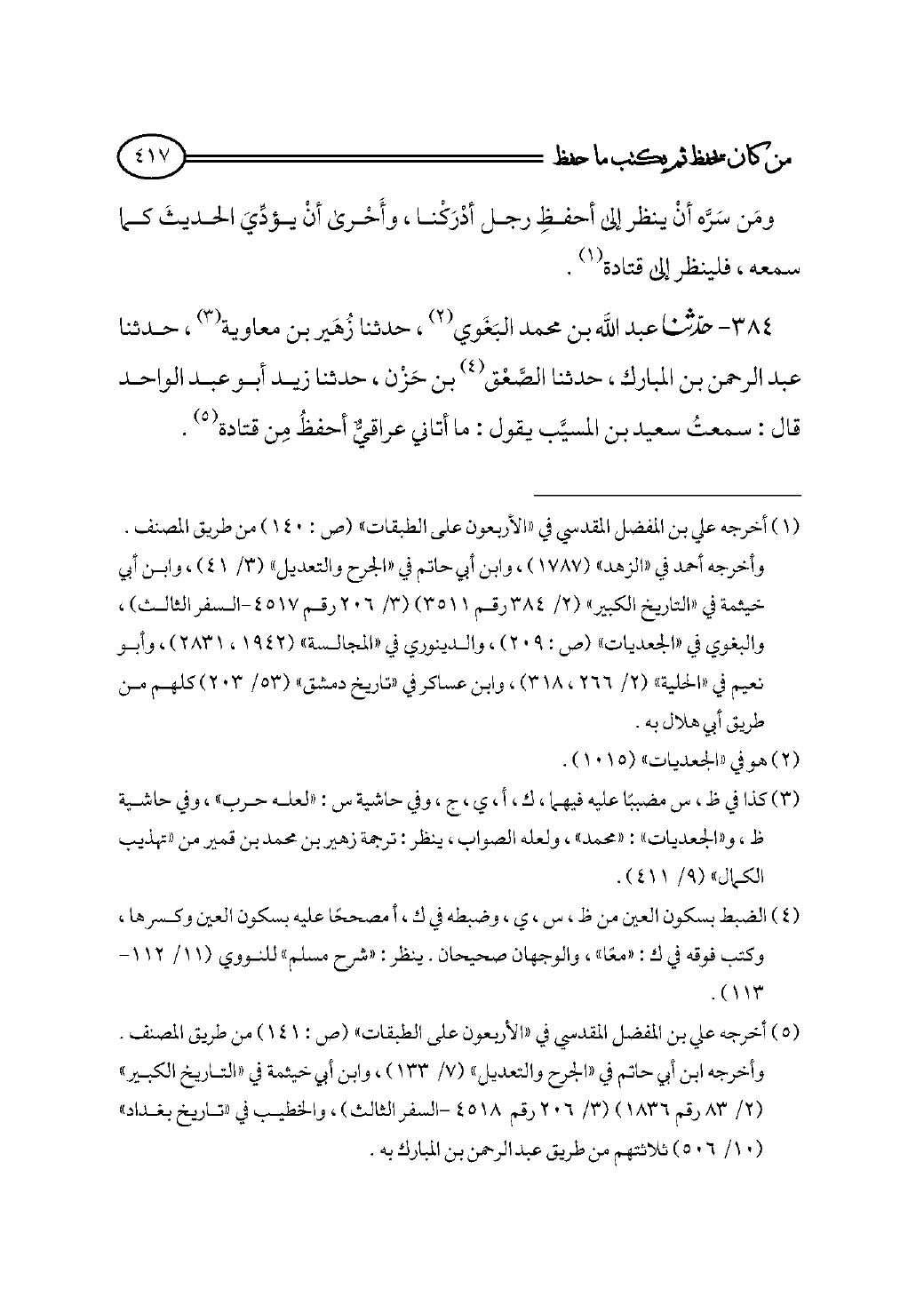 ٣٨٤ - حدثنا عبد الله بن محمد البَغَوي (¬٢)، حدثنا زُهَير بن معاوية (¬٣)، حدثنا عبد الرحمن بن المبارك، حدثنا الصَّعْق (¬٤) بن حَزْن، حدثنا زيد أبو عبد الواحد قال: سمعتُ سعيد بن المسيَّب يقول: ما أتاني عراقيٌّ أحفظُ مِن قتادة (¬٥).