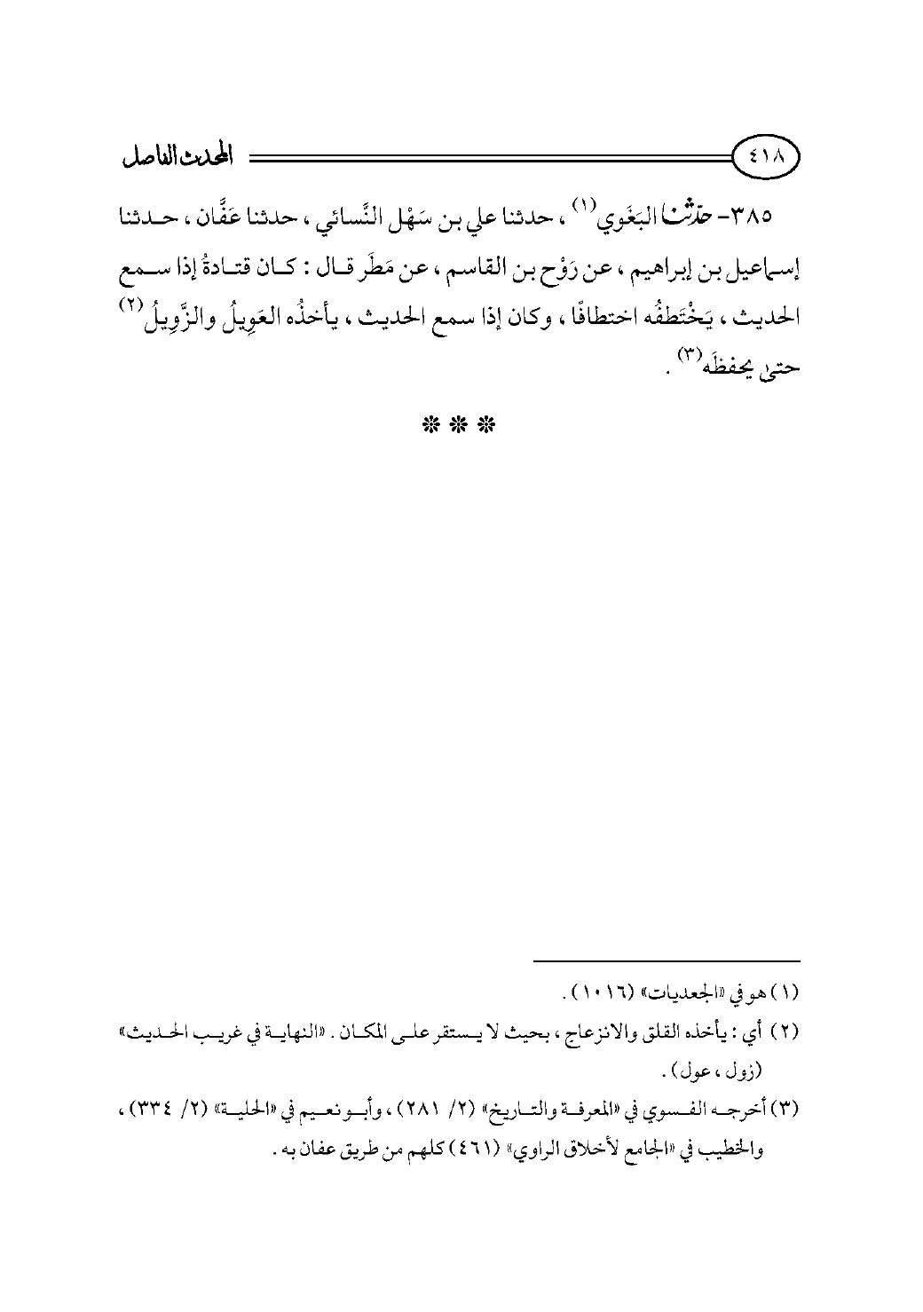 ٣٨٥ - حدثنا البَغَوي (¬١)، حدثنا علي بن سَهْل النَّسائي، حدثنا عَفَّان، حدثنا إسماعيل بن إبراهيم، عن رَوْح بن القاسم، عن مَطَر قال: كان قتادةُ إذا سمع الحديث، يَخْتَطفُه اختطافًا، وكان إذا سمع الحديث، يأخذُه العَوِيلُ والزَّوِيلُ (¬٢) حتى يحفظَه (¬٣).