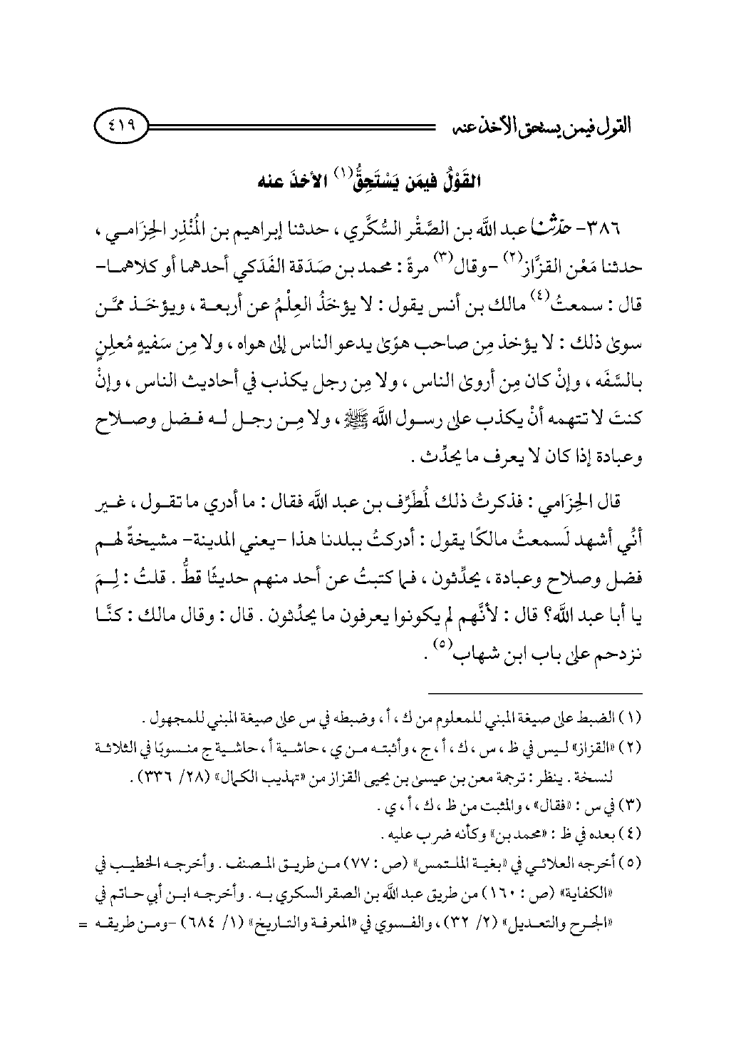 ٣٨٦ - حدثنا عبد الله بن الصَّقْر السُّكَّري، حدثنا إبراهيم بن المُنْذِر الحِزَامي، حدثنا مَعْن القزَّاز (¬٢) -وقال (¬٣) مرةً: محمد بن صَدَقة الفَدَكي أحدهما أو كلاهما- قال: سمعتُ (¬٤) مالك بن أنس يقول: لا يؤخَذُ العِلْمُ عن أربعة، ويؤخَذ ممَّن سوى ذلك: لا يؤخذ مِن صاحب هوًى يدعو الناس إلى هواه، ولا مِن سَفيهٍ مُعلِنٍ بالسَّفَه، وإنْ كان مِن أروى الناس، ولا مِن رجل يكذب في أحاديث الناس، وإنْ كنتَ لا تتهمه أنْ يكذب على رسول الله - صلى الله عليه وسلم -، ولا مِن رجل له فضل وصلاح وعبادة إذا كان لا يعرف ما يحدِّث.