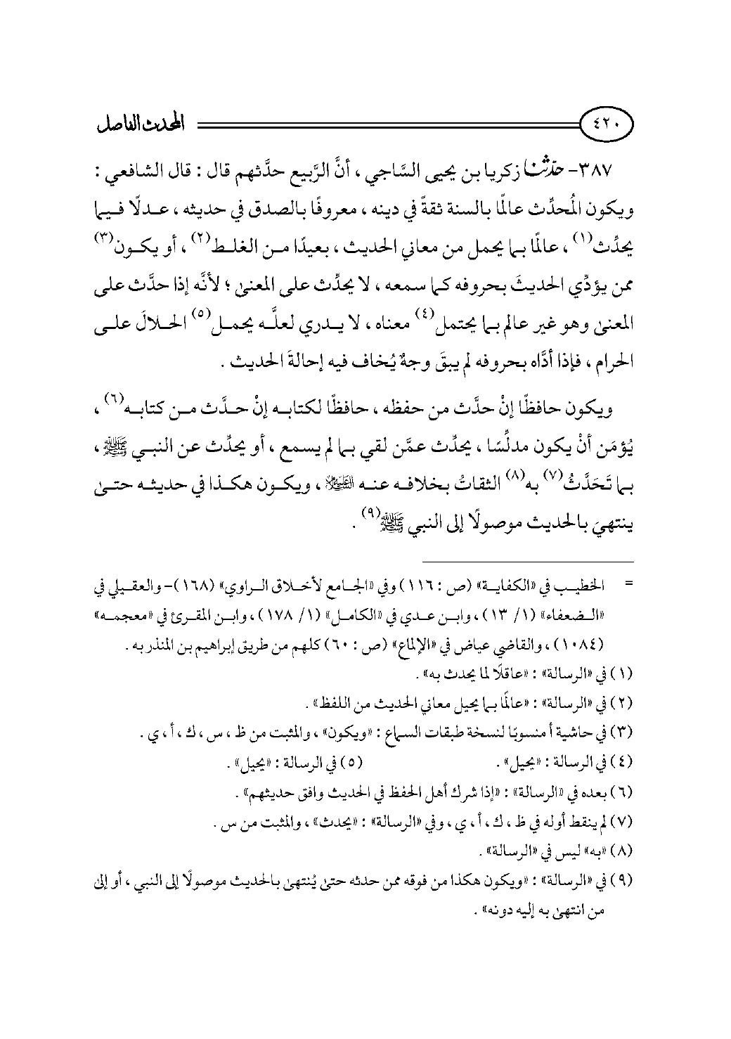 ٣٨٧ - حدثنا زكريا بن يحيى السَّاجي، أنَّ الرَّبيع حدَّثهم قال: قال الشافعي: ويكون المُحدِّث عالمًا بالسنة ثقةً في دينه, معروفًا بالصدق في حديثه, عدلًا فيما يحدِّث (¬١) , عالمًا بما يحمل من معاني الحديث، بعيدًا من الغلط (¬٢)، أو يكون (¬٣) ممن يؤدِّي الحديثَ بحروفه كما سمعه، لا يحدِّث على المعنى؛ لأنَّه إذا حدَّث على المعنى وهو غير عالم بما يحتمل (¬٤) معناه، لا يدري لعلَّه يحمل (¬٥) الحلالَ على الحرام، فإذا أدَّاه بحروفه لم يبقَ وجهٌ يُخاف فيه إحالةَ الحديث.