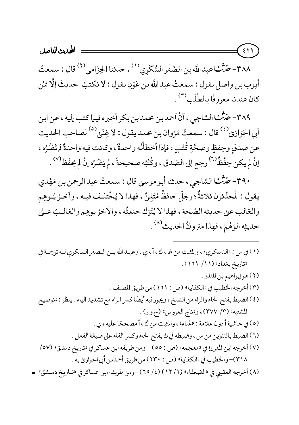 ٣٨٩ - حدثنا السَّاجي، أنَّ أحمد بن محمد بن بكر أخبره فيما كتب إليه، عن ابن أبي الحَوَارَى (¬٤) قال: سمعتُ مَرْوان بن محمد يقول: لا غِنًى (¬٥) لصاحب الحديث عن صدقٍ وحِفظٍ وصحَّةِ كُتُبٍ، فإذا أخطأَتْه واحدةٌ، وكانت فيه واحدةٌ لم تَضُرَّه، إنْ لم يكن حِفْظٌ (¬٦) رجع إلى الصِّدق، وكُتُبُه صحيحةٌ، لم يَضُرَّه إنْ لم يحفَظْ (¬٧).