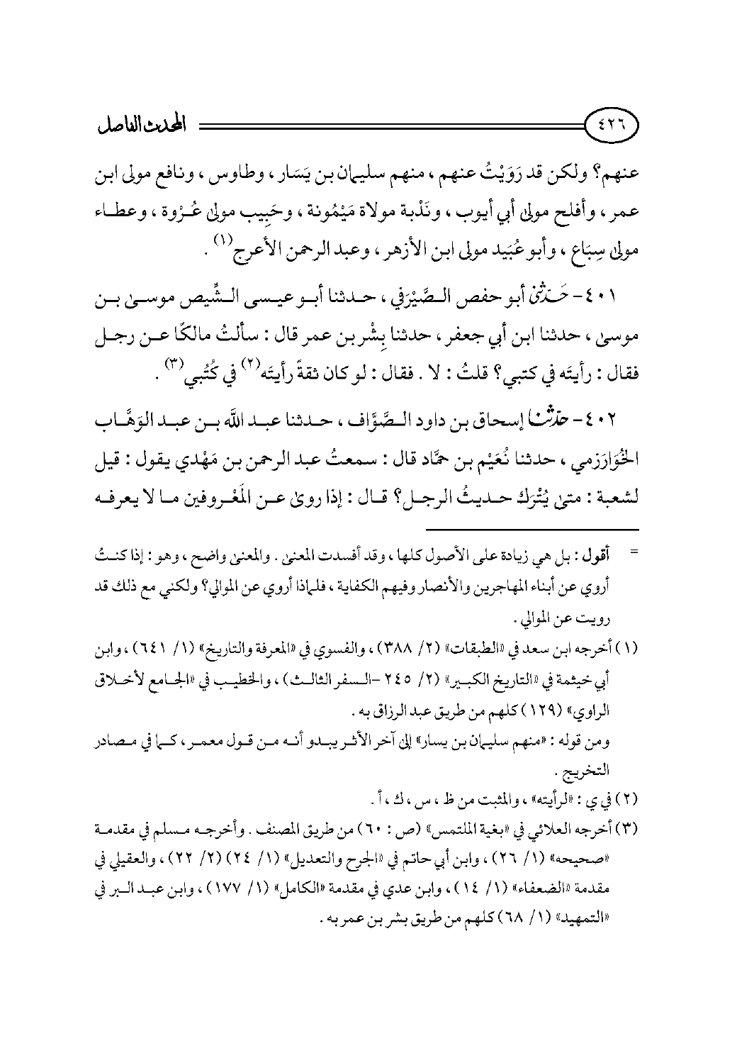 ٤٠١ - حدثني أبو حفص الصَّيْرَفي، حدثنا أبو عيسى الشِّيص موسى بن موسى، حدثنا ابن أبي جعفر، حدثنا بِشْر بن عمر قال: سألتُ مالكًا عن رجل فقال: رأيتَه في كتبي؟ قلتُ: لا. فقال: لو كان ثقةً رأيتَه (¬٢) في كُتُبي (¬٣).