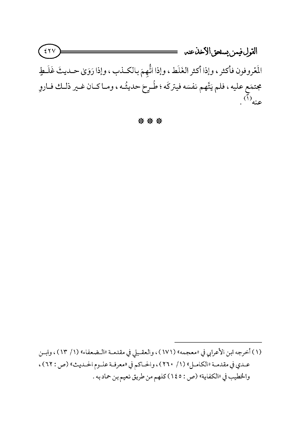 (¬١) أخرجه ابن الأعرابي في «معجمه» (١٧١)، والعقيلي في مقدمة «الضعفاء» (١/ ١٣)، وابن عدي في مقدمة «الكامل» (١/ ٢٦٠)، والحاكم في «معرفة علوم الحديث» (ص: ٦٢)، والخطيب في «الكفاية» (ص: ١٤٥) كلهم من طريق نعيم بن حماد به.