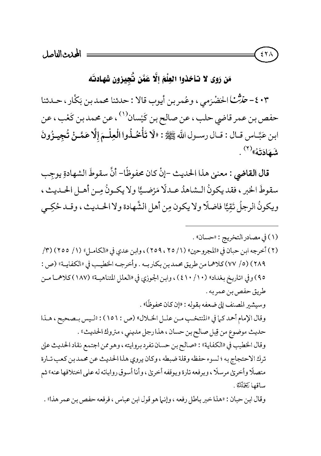 ٤٠٣ - حدثنا الحَضْرَمي، وعُمر بن أيوب قالا: حدثنا محمد بن بَكَّار، حدثنا حفص بن عمر قاضي حلب، عن صالح بن كَيْسان (¬١)، عن محمد بن كَعْب، عن ابن عَبَّاس قال: قال رسول الله - صلى الله عليه وسلم - : «لَا تَأْخُذُوا الْعِلْمَ إِلَّا عَمَّنْ تُجِيزُونَ شَهَادَتَهُ» (¬٢).