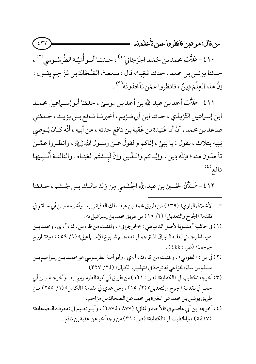 ٤١٠ - حدثنا محمد بن حُمَيد الجُرْجَاني (¬١)، حدثنا أبو أُمَيَّة الطَّرَسُوسي (¬٢)، حدثنا يونس بن محمد، حدثنا مُغِيث قال: سمعتُ الضَّحَّاك بن مُزَاحِم يقول: إنَّ هذا العِلْمَ دِينٌ، فانظروا عمَّن تأخذونَه (¬٣).