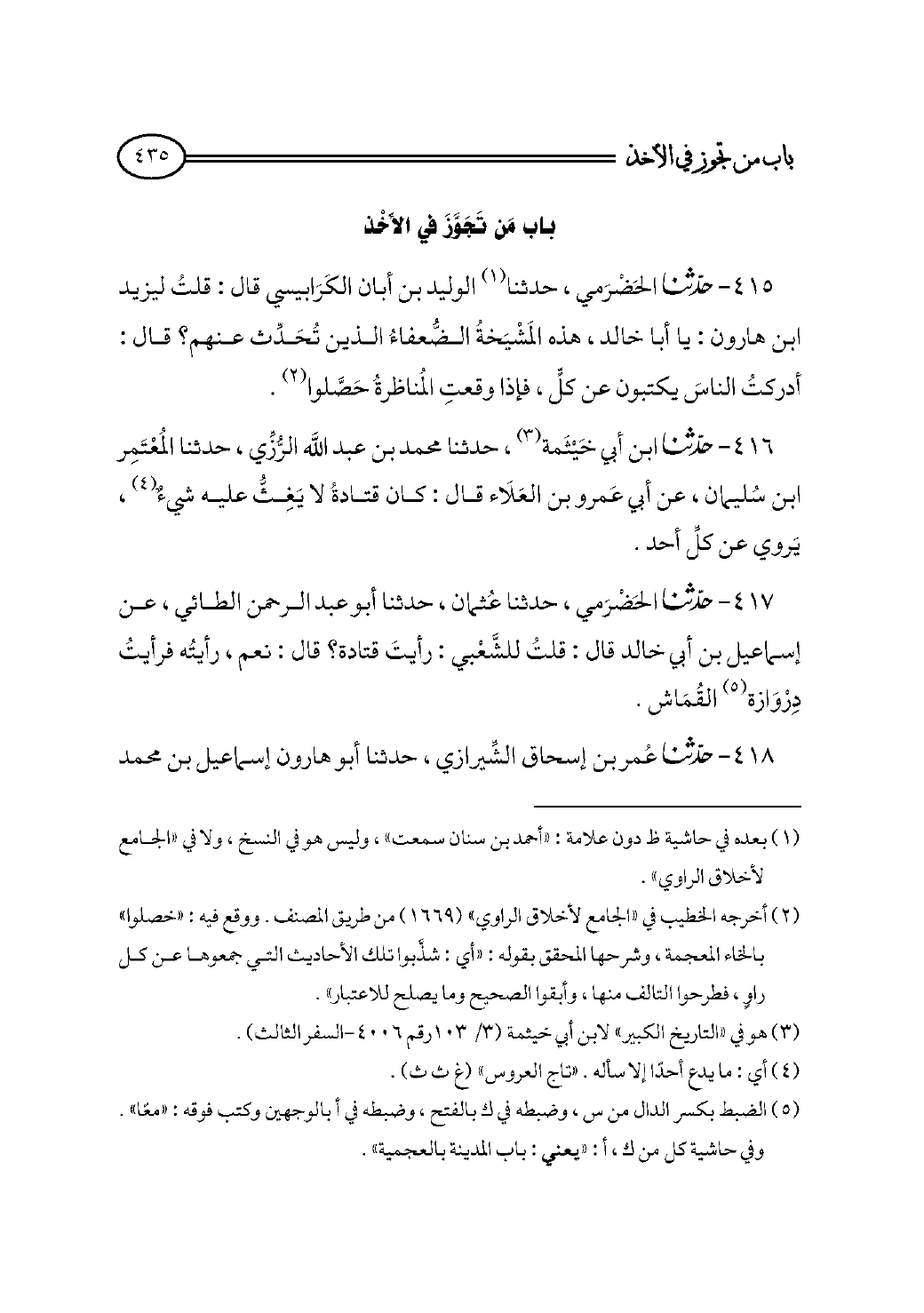 ٤١٥ - حدثنا الحَضْرَمي، حدثنا (¬١) الوليد بن أبان الكَرَابيسي قال: قلتُ ليزيد ابن هارون: يا أبا خالد، هذه المَشْيَخةُ الضُّعفاءُ الذين تُحَدِّث عنهم؟ قال: أدركتُ الناسَ يكتبون عن كلٍّ، فإذا وقعتِ المُناظرةُ حَصَّلوا (¬٢).