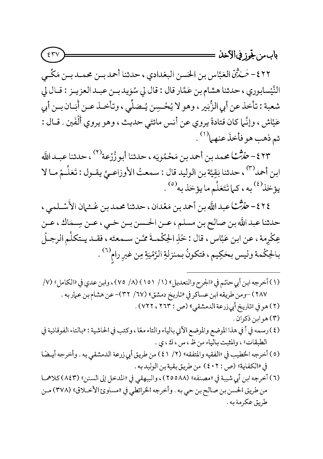 ٤٢٣ - حدثنا محمد بن أحمد بن مَحْمُويَه، حدثنا أبو زُرْعة (¬٢)، حدثنا عبد الله ابن أحمد (¬٣)، حدثنا بَقِيَّة بن الوليد قال: سمعتُ الأوزاعيَّ يقول: تَعَلَّمْ ما لا يؤخَذ (¬٤) به، كما تَتَعَلَّم ما يؤخَذ به (¬٥).