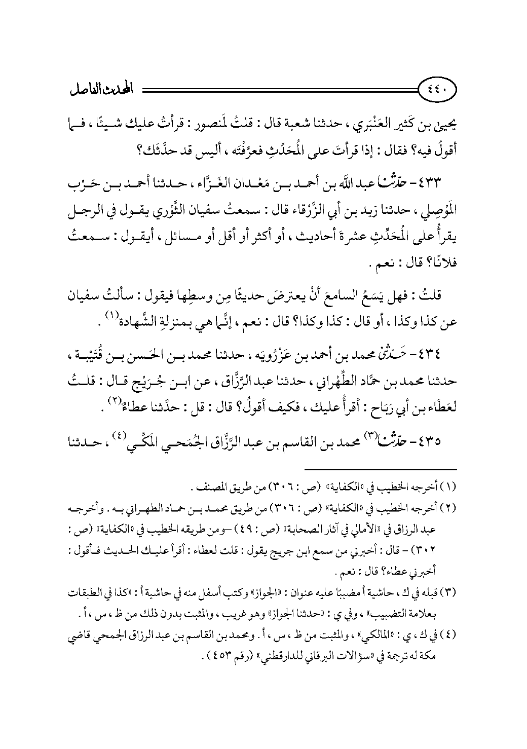 ٤٣٣ - حدثنا عبد الله بن أحمد بن مَعْدان الغَزَّاء، حدثنا أحمد بن حَرْب المَوْصِلي، حدثنا زيد بن أبي الزَّرْقاء قال: سمعتُ سفيان الثَّوْري يقول في الرجل يقرأُ على المُحَدِّثِ عشرةَ أحاديث، أو أكثر أو أقل أو مسائل، أيقول: سمعتُ فلانًا؟ قال: نعم.