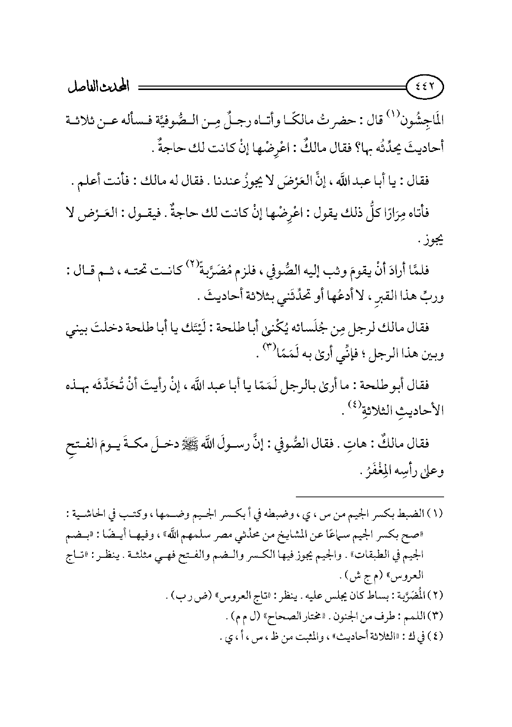 المَاجِشُون (¬١) قال: حضرتُ مالكًا وأتاه رجلٌ مِن الصُّوفيَّة فسأله عن ثلاثة أحاديثَ يحدِّثُه بها؟ فقال مالكٌ: اعْرِضْها إنْ كانت لك حاجةٌ.