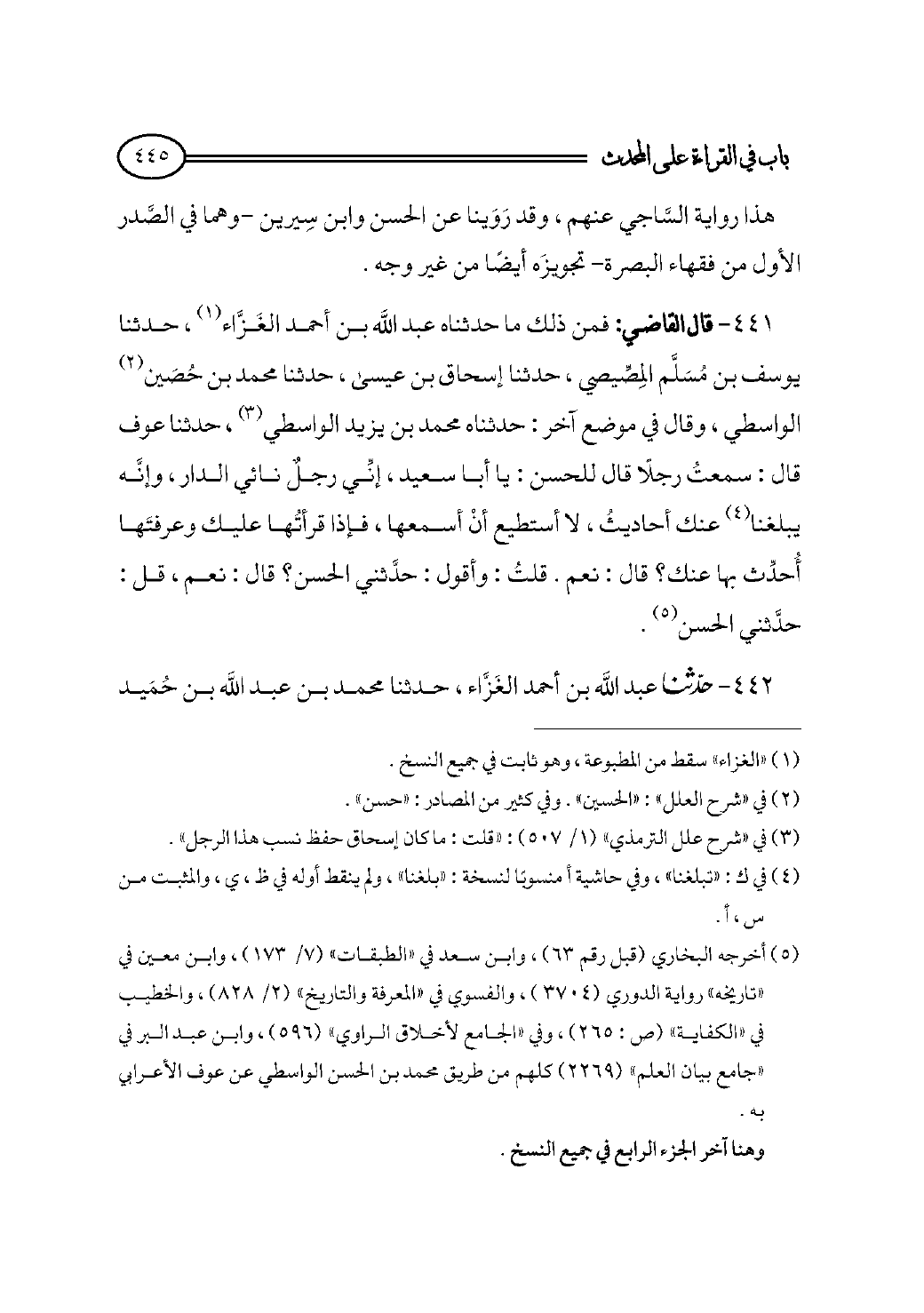 ٤٤١ - قال القاضي: فمن ذلك ما حدثناه عبد الله بن أحمد الغَزَّاء (¬١)، حدثنا يوسف بن مُسَلَّم المِصِّيصي، حدثنا إسحاق بن عيسى، حدثنا محمد بن حُصَين (¬٢) الواسطي، وقال في موضع آخر: حدثناه محمد بن يزيد الواسطي (¬٣)، حدثنا عوف قال: سمعتُ رجلًا قال للحسن: يا أبا سعيد، إنِّي رجلٌ نائي الدار، وإنَّه يبلغنا (¬٤) عنك أحاديثُ، لا أستطيع أنْ أسمعها، فإذا قرأتُها عليك وعرفتَها أُحدِّث بها عنك؟ قال: نعم. قلتُ: وأقول: حدَّثني الحسن؟ قال: نعم، قل: حدَّثني الحسن (¬٥).