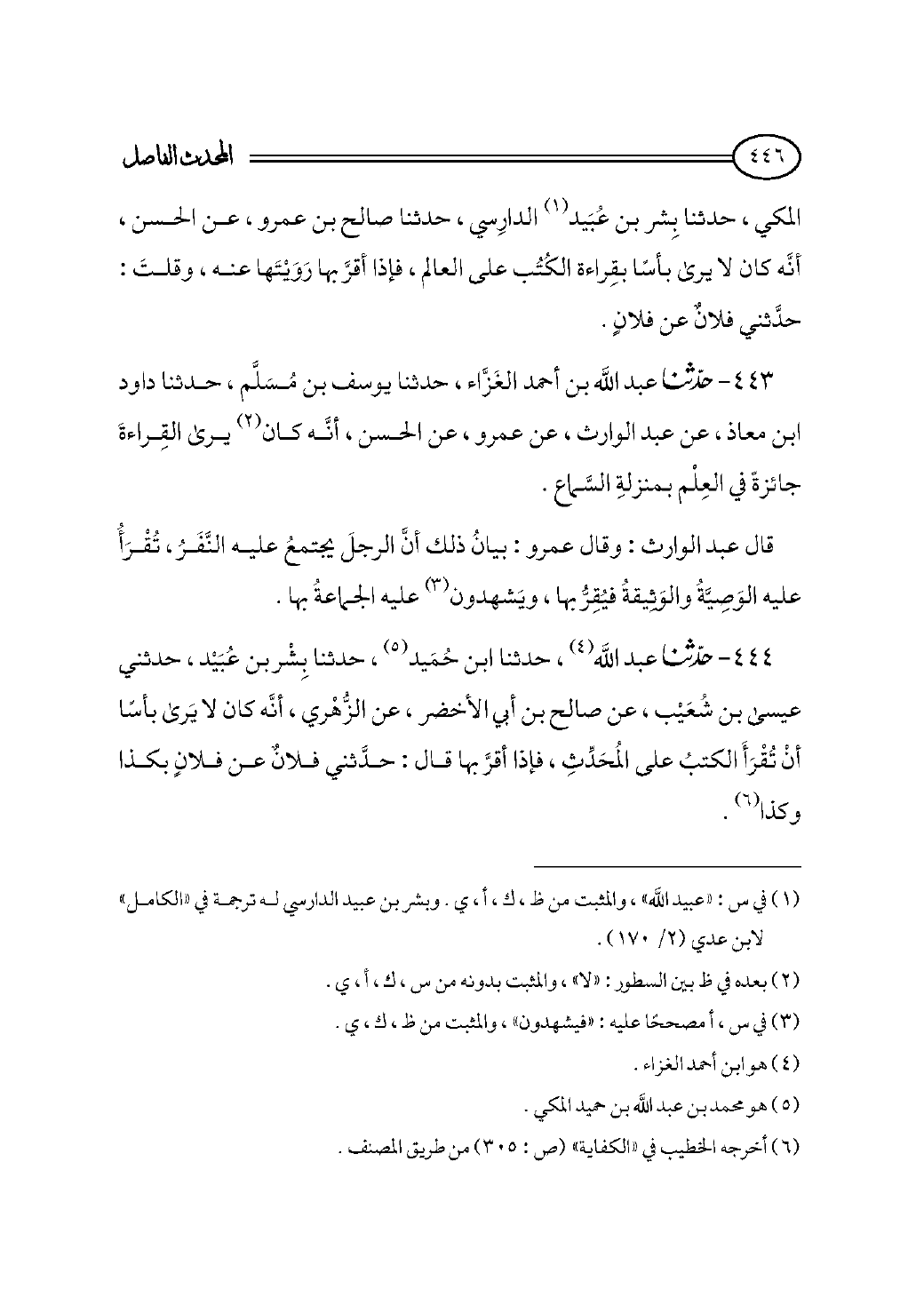 ٤٤٣ - حدثنا عبد الله بن أحمد الغَزَّاء، حدثنا يوسف بن مُسَلَّم، حدثنا داود ابن معاذ، عن عبد الوارث، عن عمرو، عن الحسن، أنَّه كان (¬٢) يرى القِراءةَ جائزةً في العِلْم بمنزلةِ السَّماع.